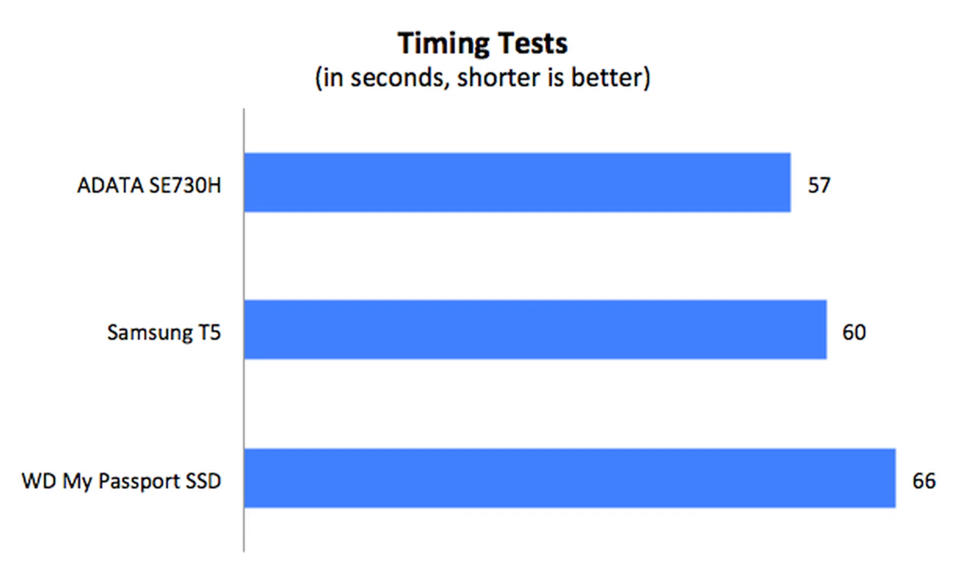 In this test, we timed how long it took for the drive to copy a folder of 16GB worth of movies, music, and photos. The ADATA SE730H came up tops with a time of 57 seconds and the Samsung Portable SSD T5 followed closely behind with a time of 60 seconds, which was about 5% slower. Finally, the WD My Passport Port SSD recorded a time of 66 seconds, which was about 10% slower than both the ADATA and Samsung drives.