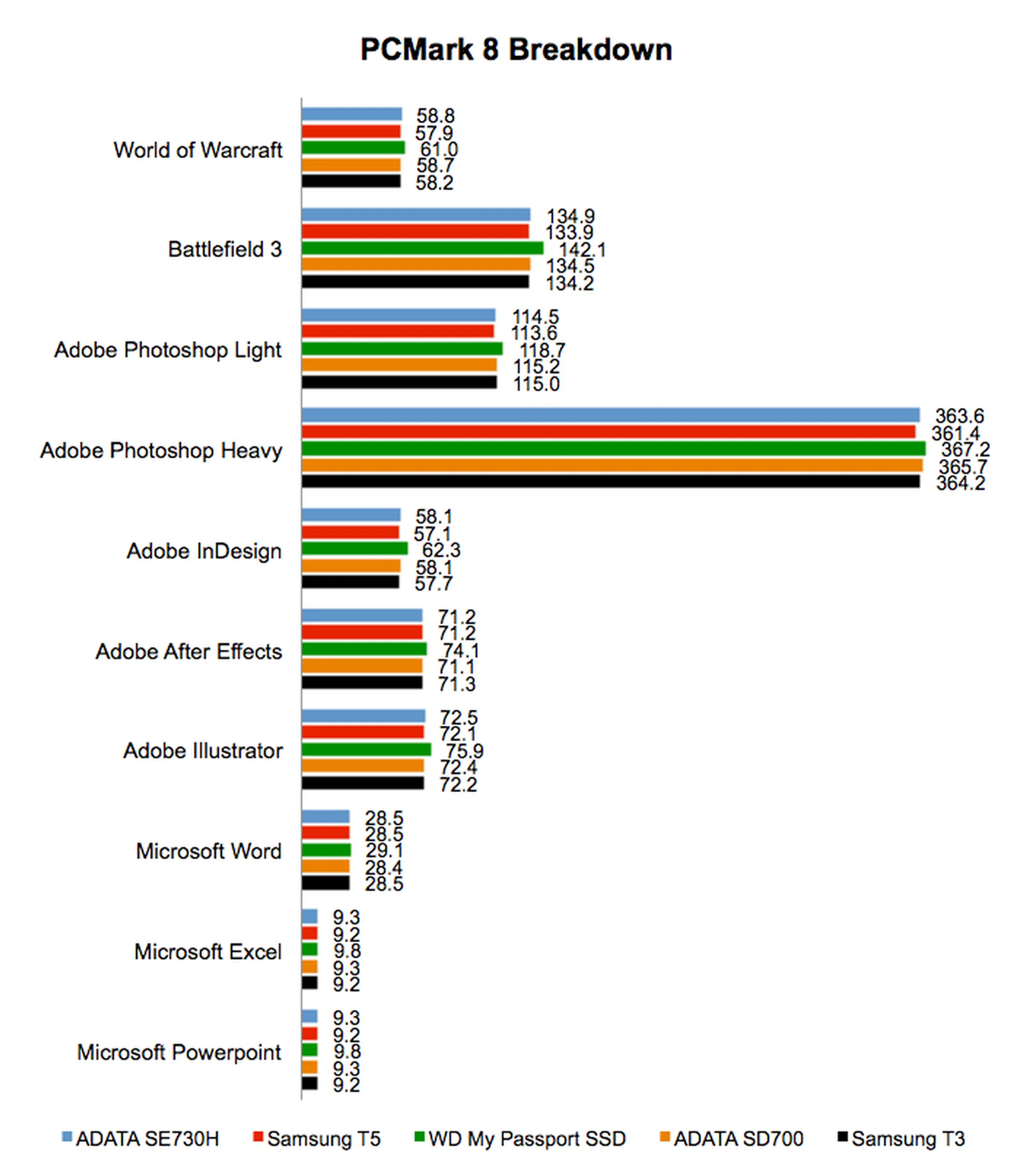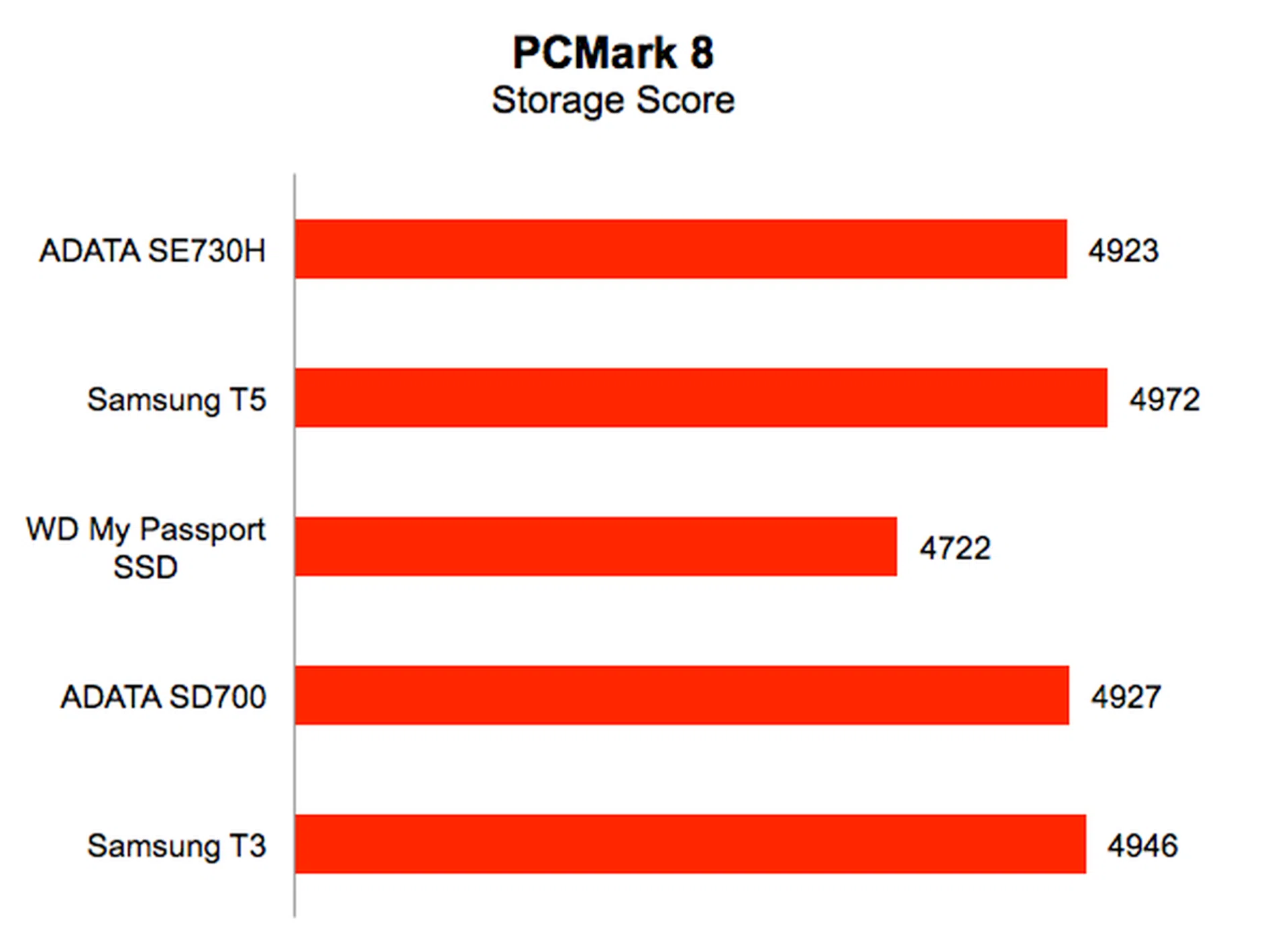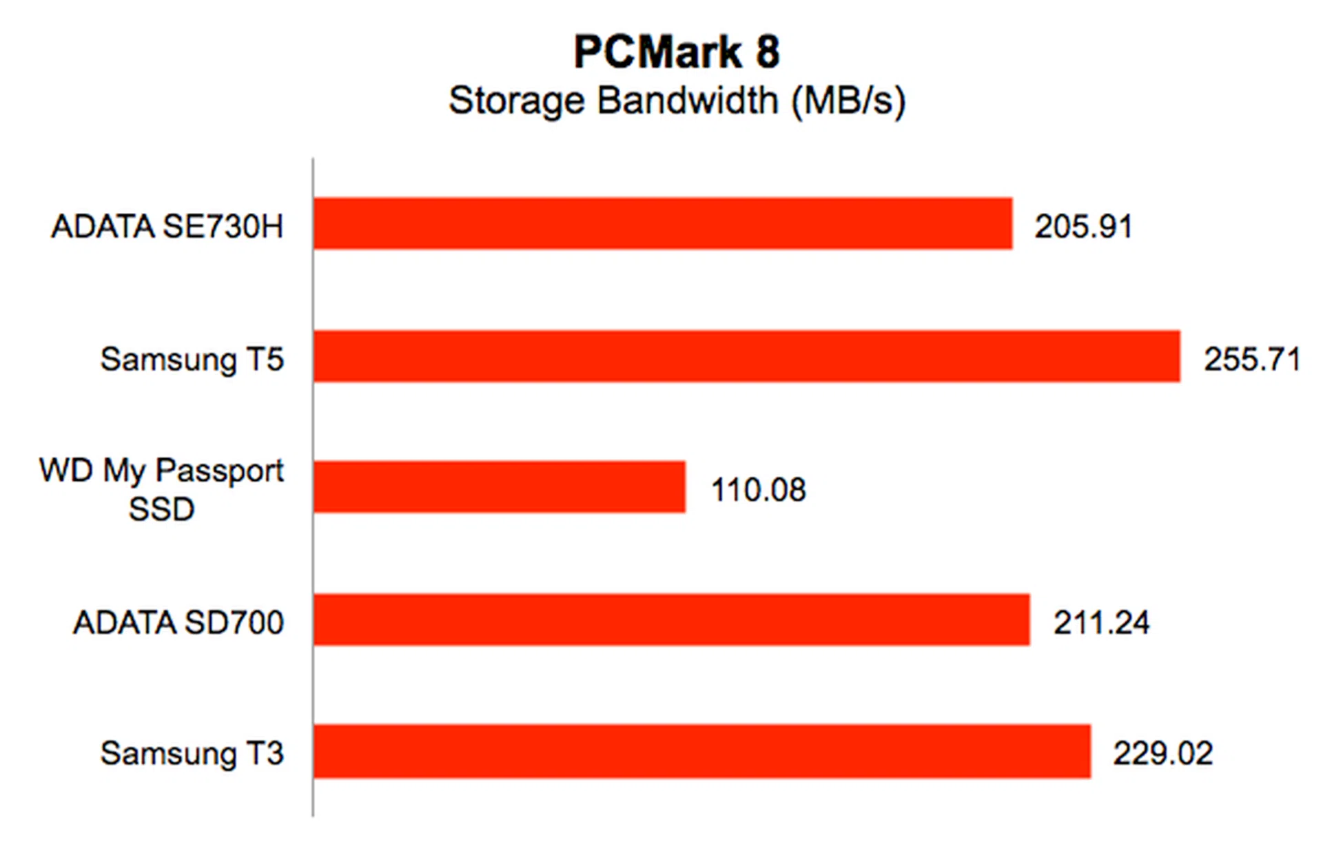 The Samsung Portable SSD T5 came out tops in PCMark 8 with a score of 4972. That’s only marginally more than the other drives, but if you look at the average speeds recorded, you’ll see that the T5 is significantly quicker. In terms of average speeds, the Samsung Portable SSD T5 came in at 255.71MB/s - that’s 24% faster than the ADATA SE730H and a whopping 232% faster than the WD My Passport SSD. Also, despite supporting “only” the slower USB 3.1 Gen 1 standard, the older ADATA SD700's and Samsung T3’s numbers were still very respectable.