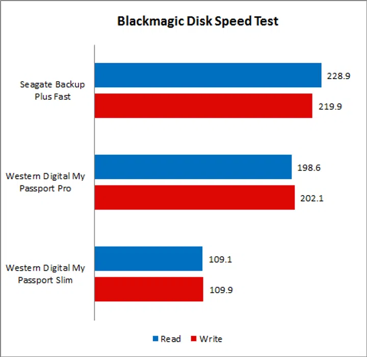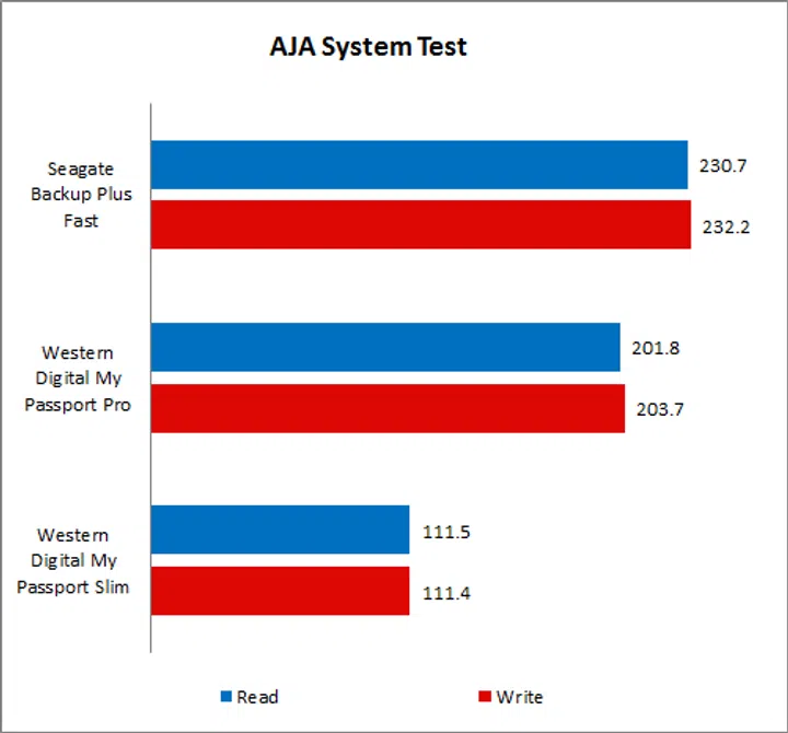 Looking at the graphs for AJA System Test and Blackmagic Disk Speed Test, it is clear that the Seagate Backup Plus Fast was the quicker drive, by around 10% to 15% overall. In our file transfer timing test, it was about 18 seconds or 20% faster, which is significant. This goes to show that for mechanical hard disk drives, even in faster RAID 0 configuration, the USB 3.0 interface provides more than sufficient bandwidth.