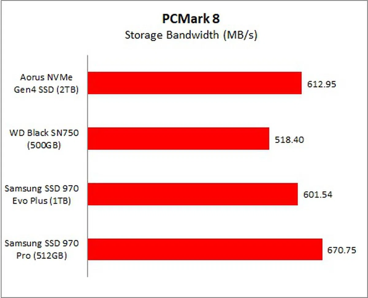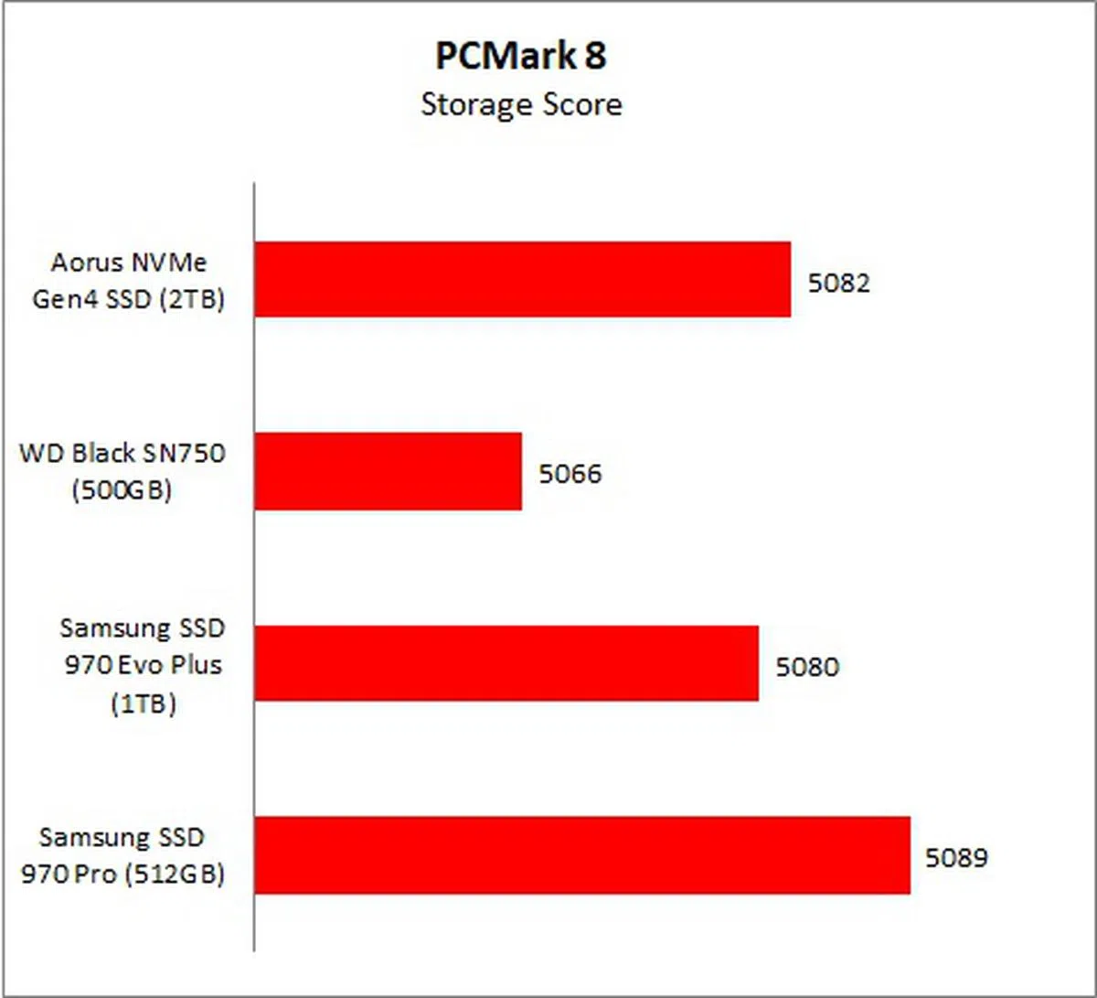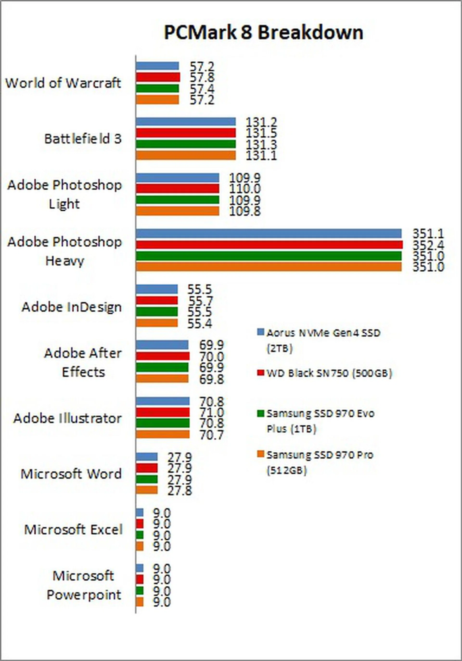In terms of gauging its real-world operations from the PCMark 8 benchmarks, there isn't a clear advantage for SSDs that support for PCIe 4.0 as the PCIe 3.0-based drives were evenly matched with the Aorus drive when it came down to Office productivity scores.