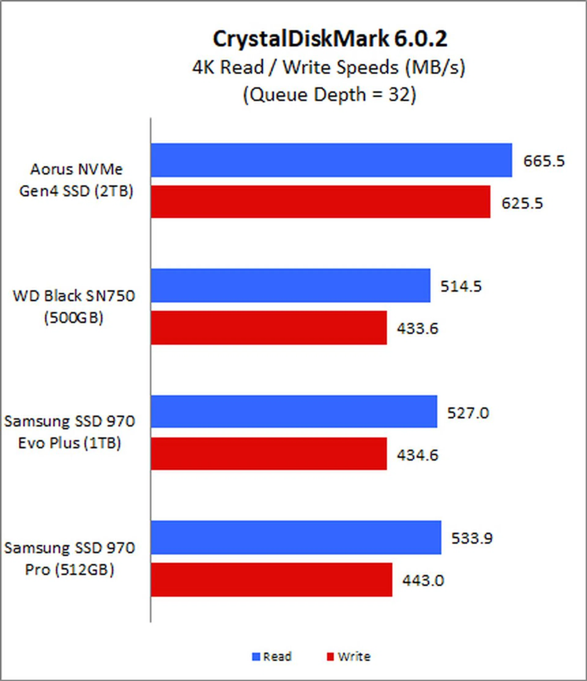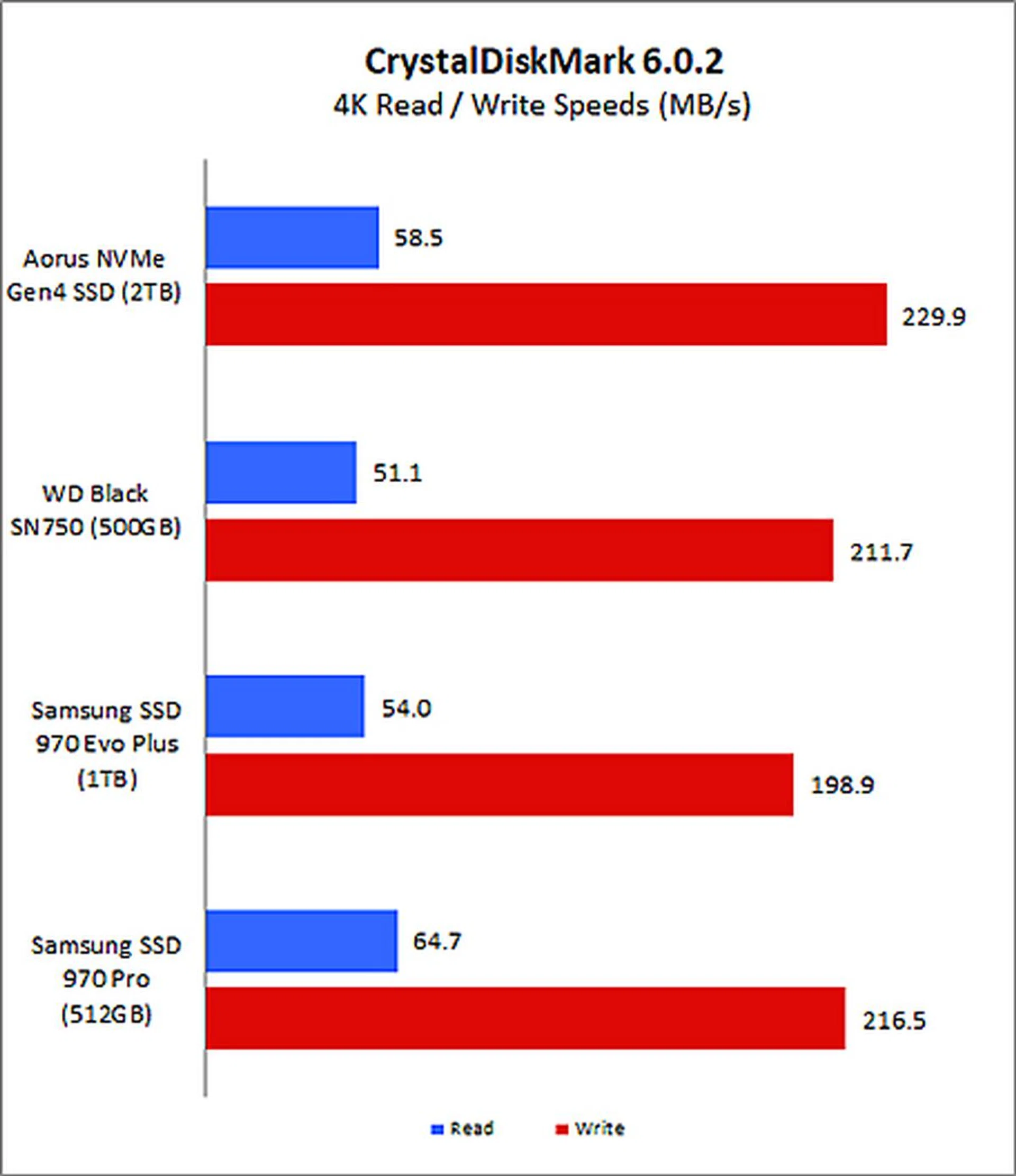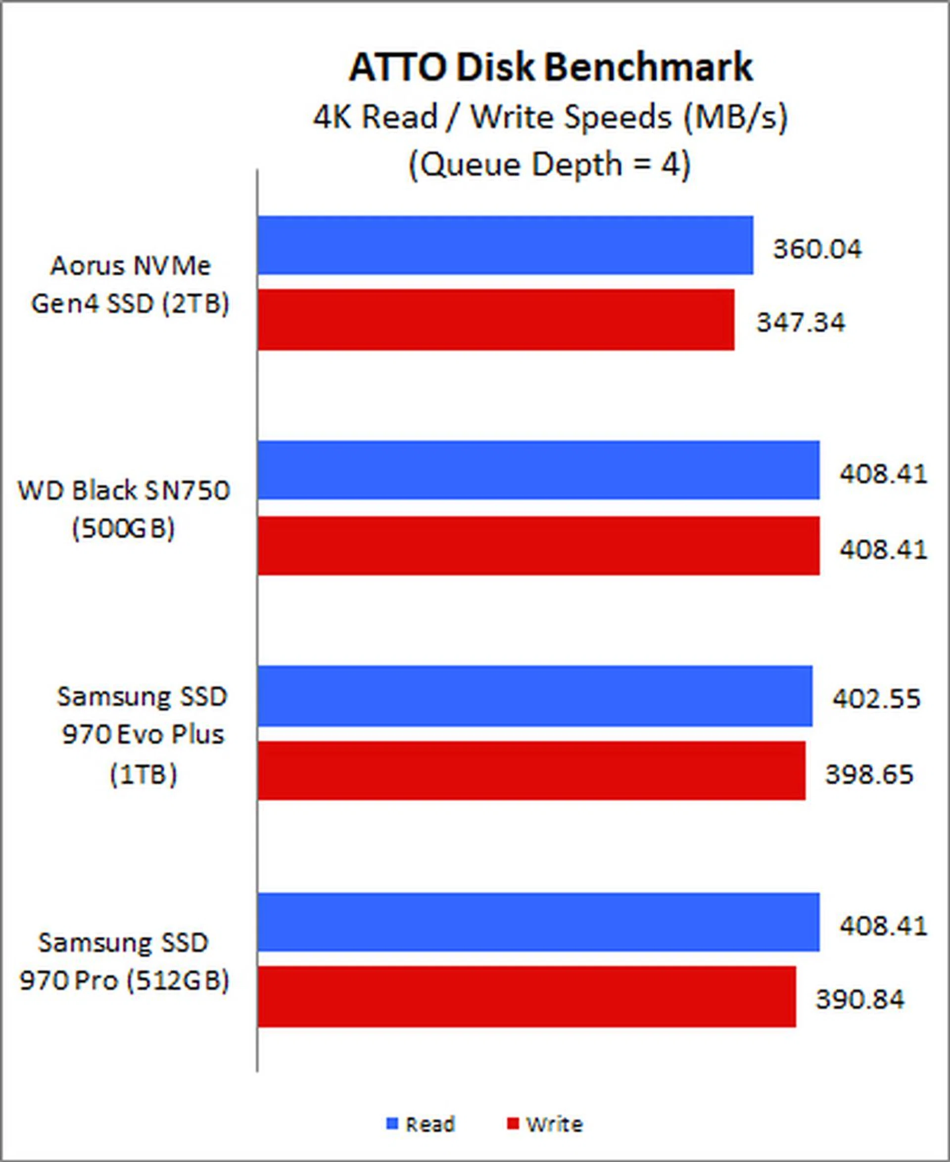 For the more demanding 4K tests, the Gigabyte Aorus continued to show its strength by turning in winning performances, this is especially evident for the 4K read/write speed test at a queue depth of 32 (QD 32).