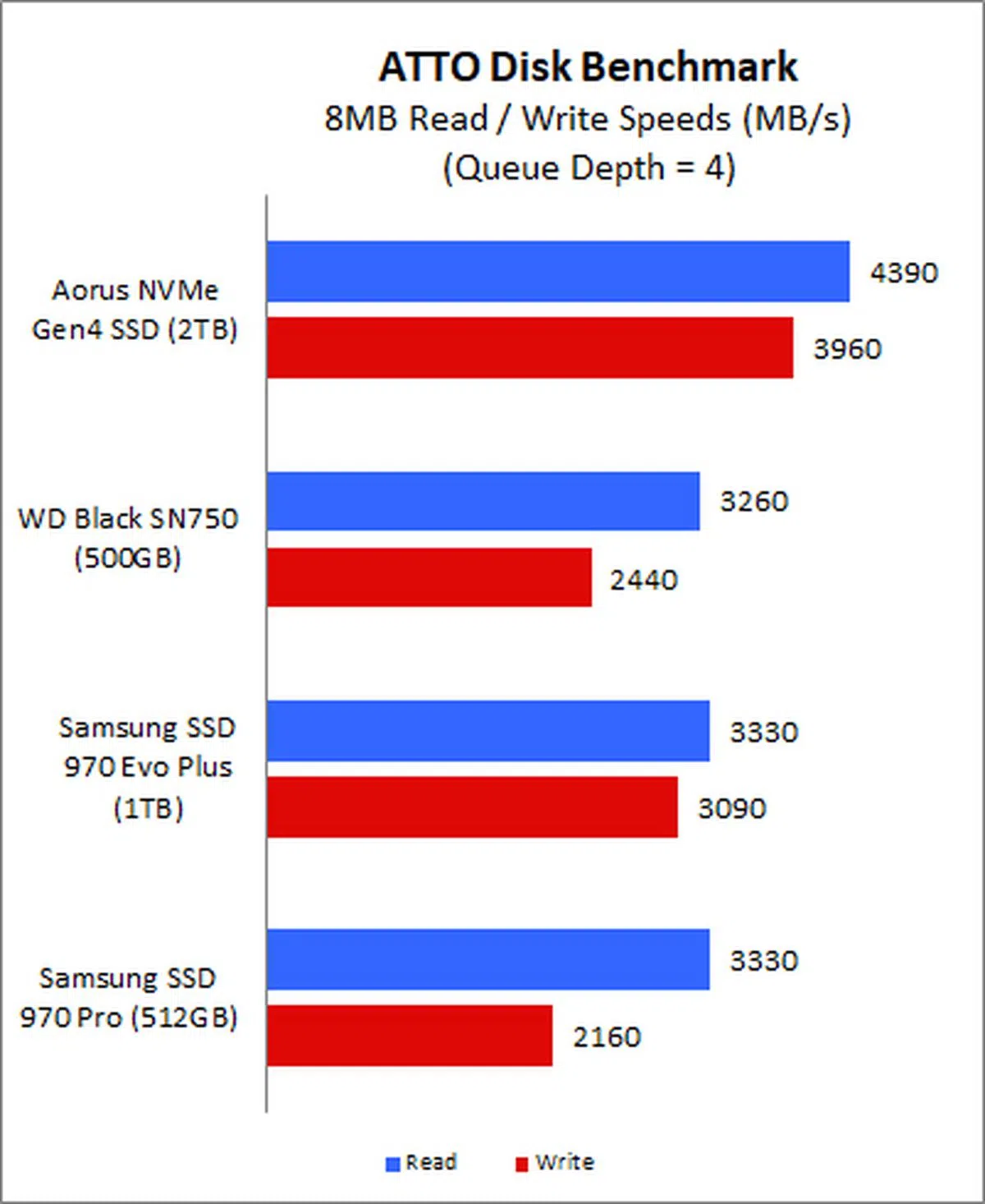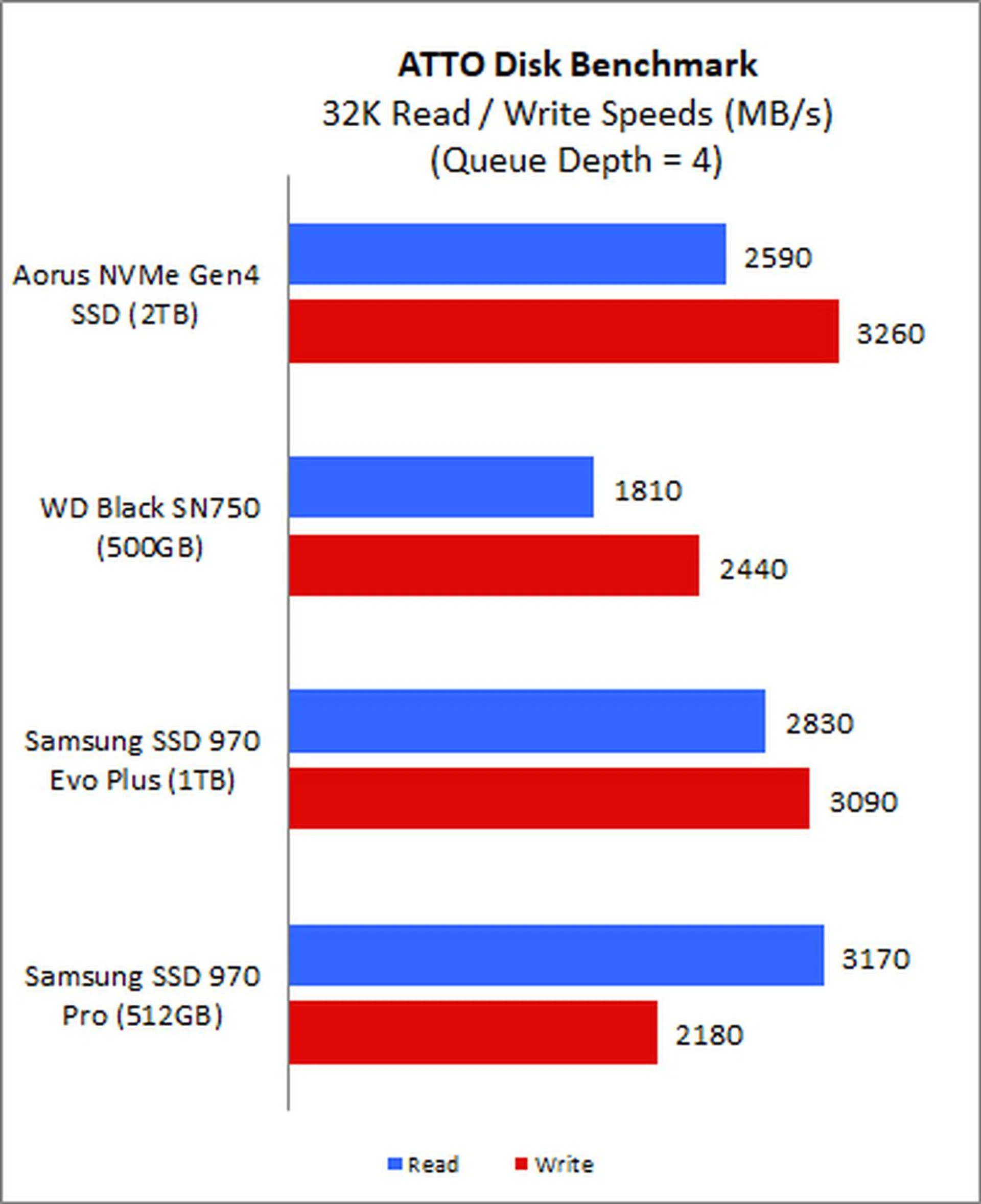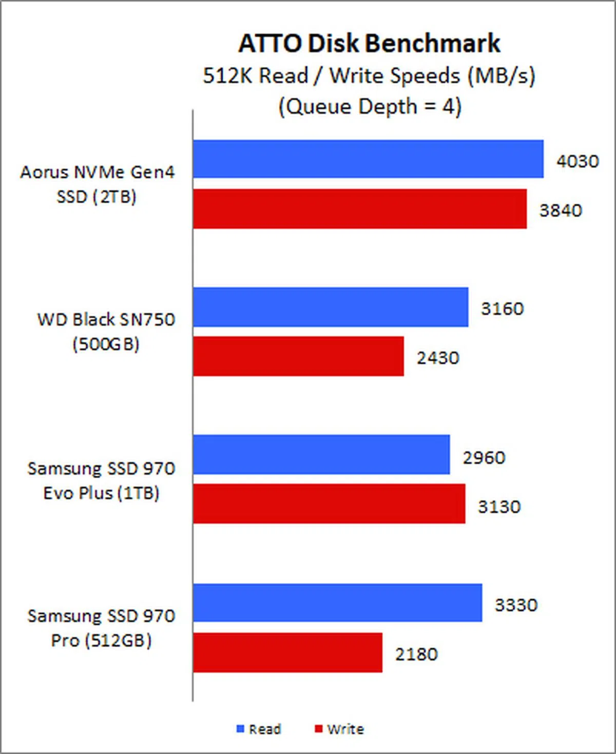 For the more demanding 4K tests, the Gigabyte Aorus continued to show its strength by turning in winning performances, this is especially evident for the 4K read/write speed test at a queue depth of 32 (QD 32).