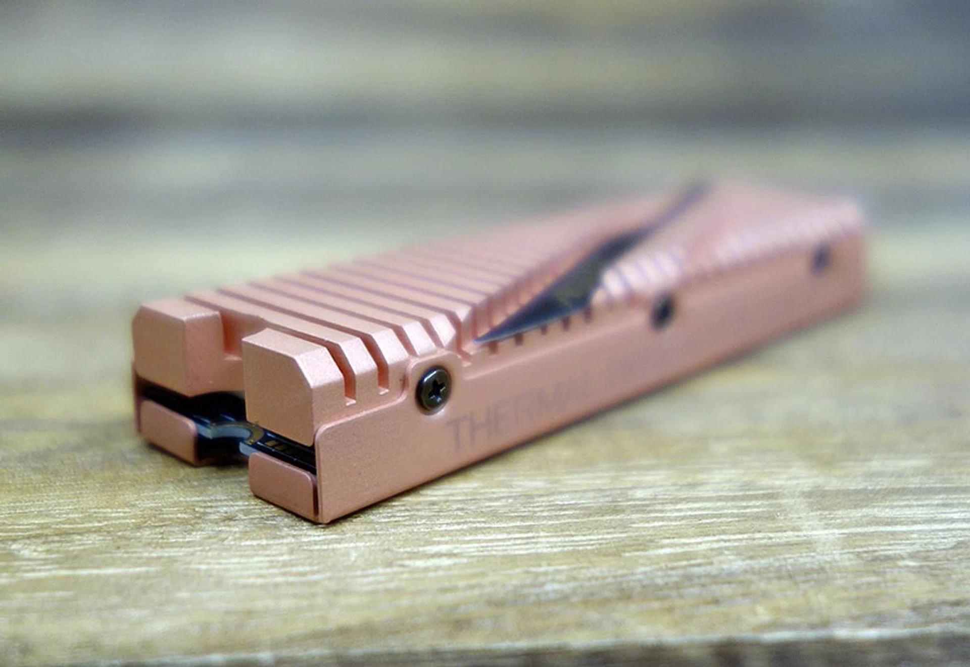 The Aorus NVMe Gen4 SSD is housed in a copper heatsink; its profile reminds us of a single Kit Kat chocolate bar. The drive comes in the M.2 form factor and measures 23.5- x 80.5- x 11.4mm (L x W x H). As a result, it's a bit larger than your typical M.2 2280 SSD.