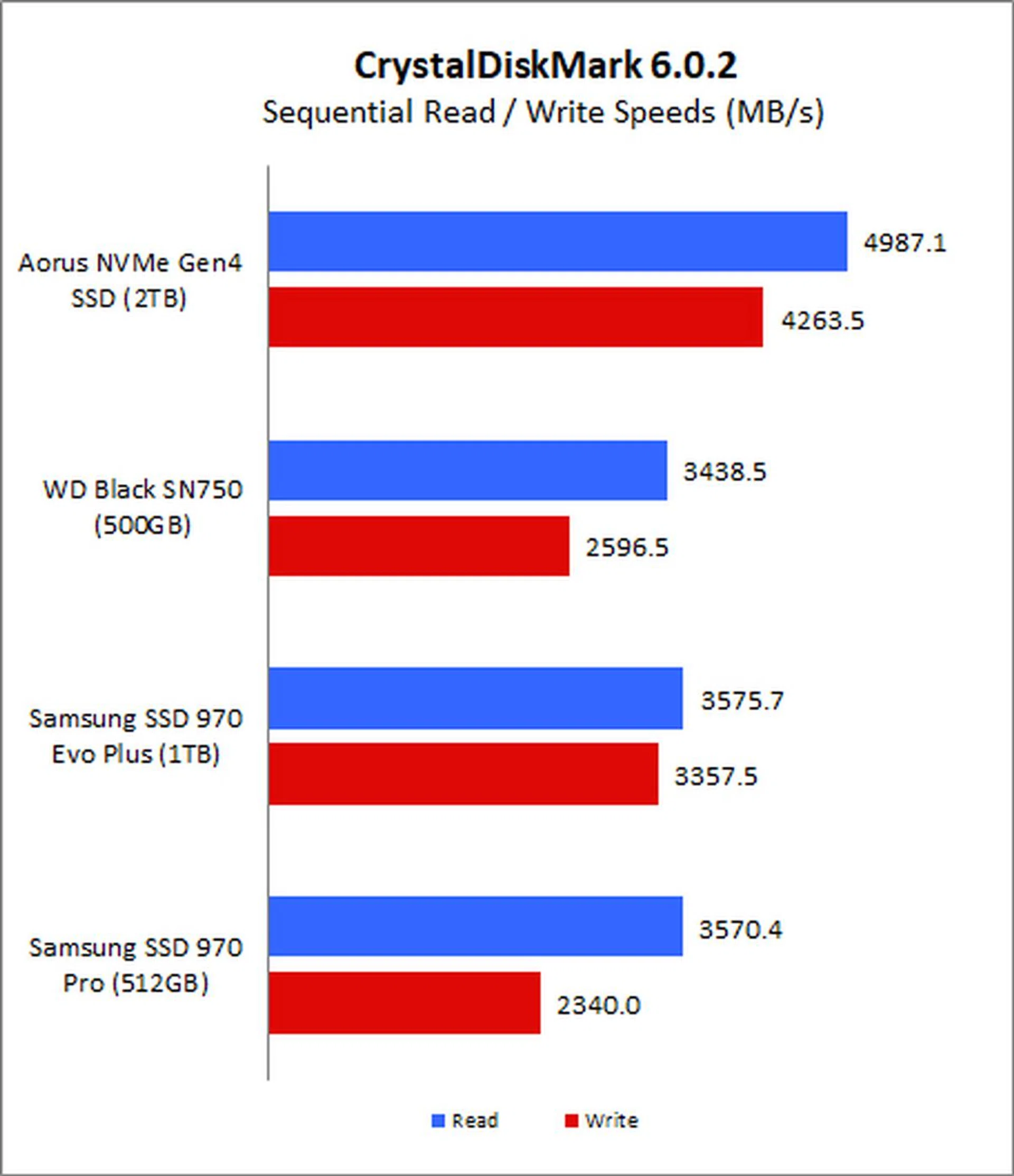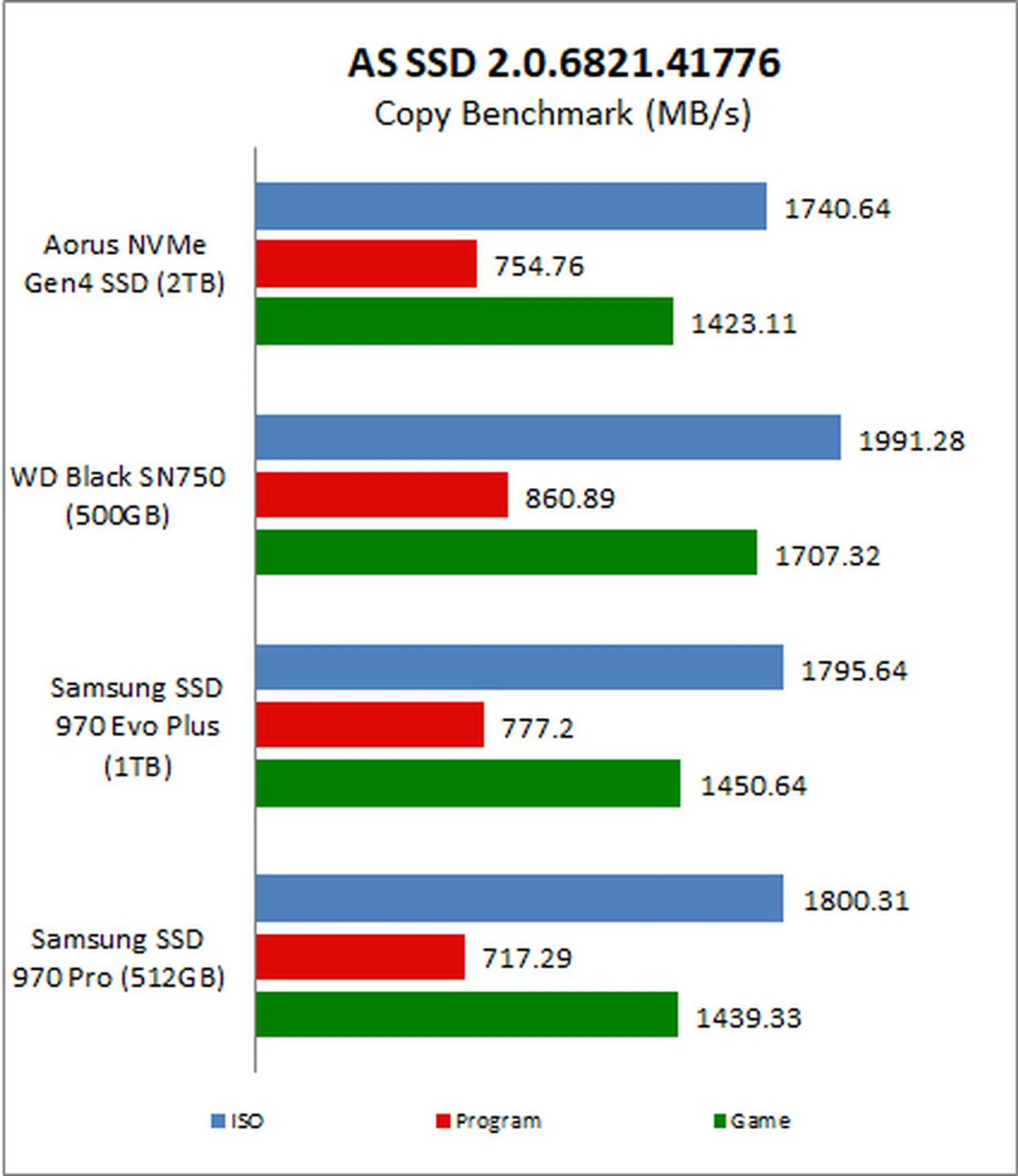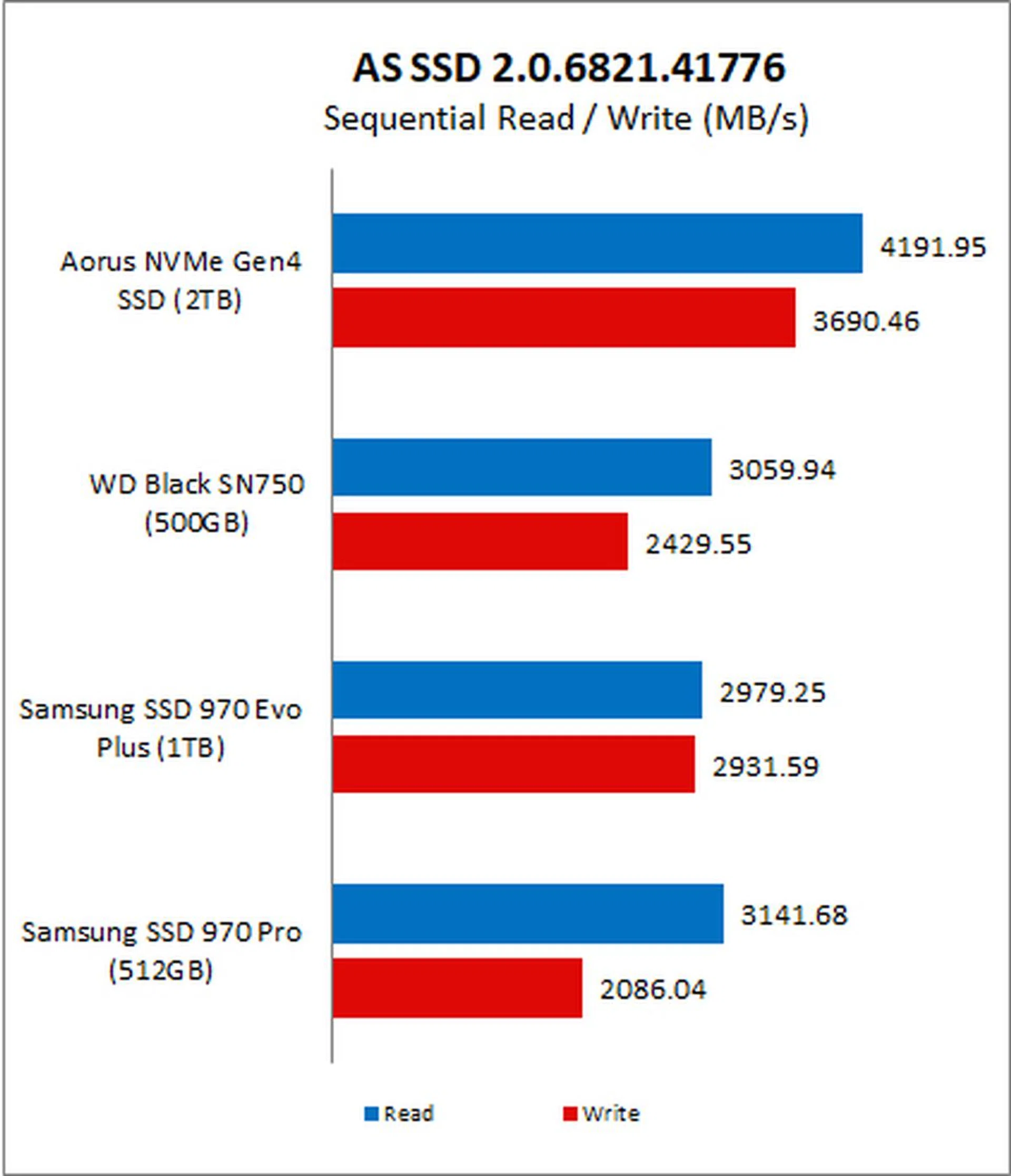 In terms of final results, the Gigabyte Aorus drive roughly 25% better than the competing PCIe 3.0 drives, i.e., the Aorus NVMe Gen4 SSD grand average score was 6,926, Samsung SSD 970 Evo Plus drive's score was 5,907, WD Black SN750 scored 5,017 and Samsung SSD 970 Pro's grand average was 4,880.