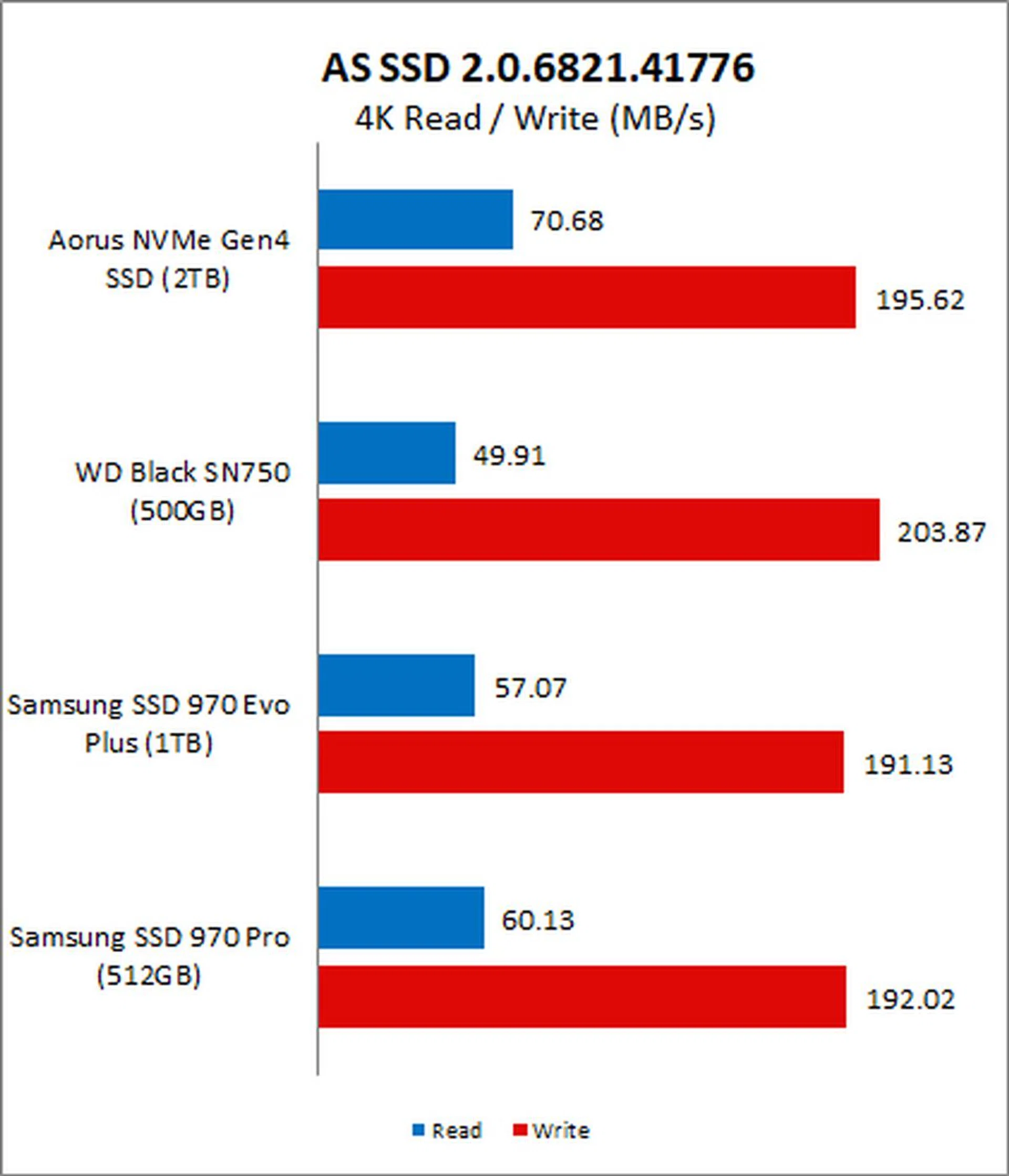 For test involving the smallest data blocks of 4K, the Aorus NVMe Gen4 SSD was the slowest.