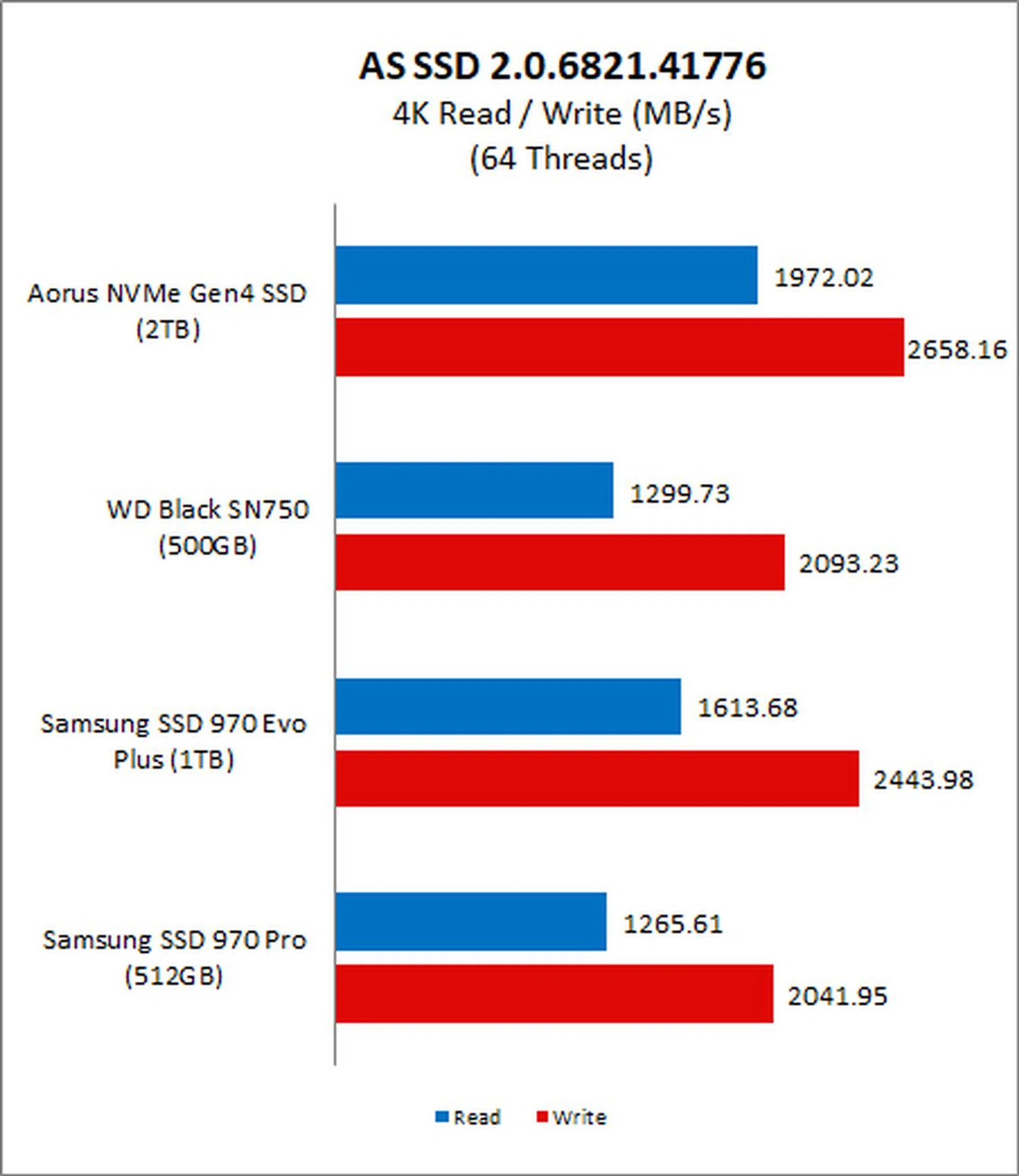 Again, its bandwidth capacity accorded by its PCIe 4.0 standard put it in top spot for the most taxing multi-threaded test, and it beat the Samsung SSD 970 Evo Plus drive by 18% for the read test, and 8% for the write test respectively.