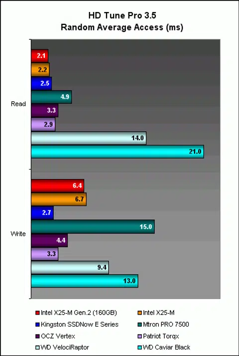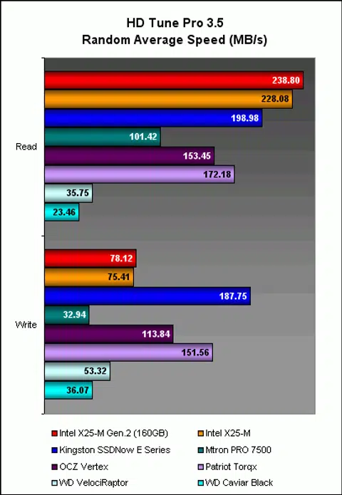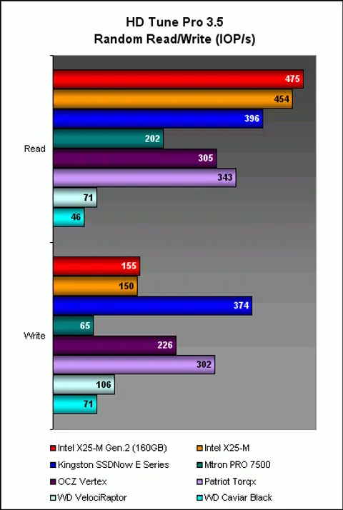 Lastly, we cast our attention on the random read/write performance of the drive. Reads were spectacular and the new Intel X25-M has set a new benchmark for others to follow. Write performance was to be expected for its caliber so we won't be nitpicking about it. Again both the Indilinix controller based drives (OCZ and Patriot) offer a more balanced IOPS for read/write performance, so it really depends on how you intend to set up your next system to capitalize on the drive you've set out to get.
