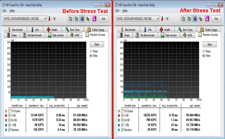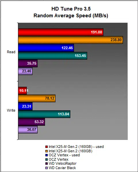 More importantly, you probably should be concerned of the random write performance which suffers even worse. The graphs below the following snapshot focus on random block transfer size testing and you can see that the Intel X25-M drives take quite a fall here. What's worse for Intel is that there's no tool to restore its performance without a complete secure erase (which means losing all your data in the process). Indilinix controller based drives are a lot luckier is this aspect since they've got a Wiper utility to rely upon which can restores performance without losing the drive contents.
