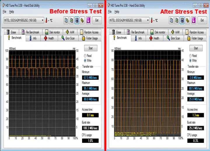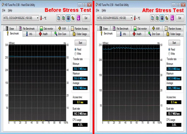 First up is the sequential read test where we compare the performance before and after the stress test. As seen in the snapshot comparisons below, there was minimal impact and it's to be expected as that's the nature of SSD drives always offering excellent read performance (254.2MB/s versus 238.2MB/s average transfer rate).