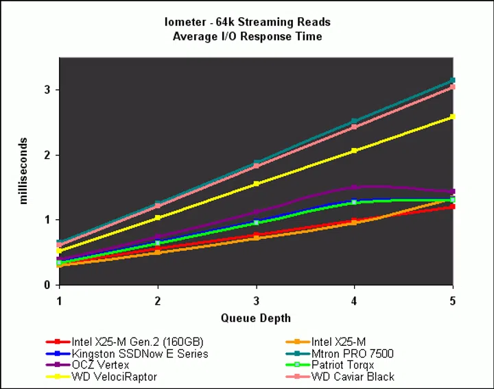 Examining the 64k streaming read and write performance, the new Intel drive came out just as expected, and is more or less on par with its predecessor - best in class read performance and average write performance (hampered only because of Intel's restriction set for the consumer drive).