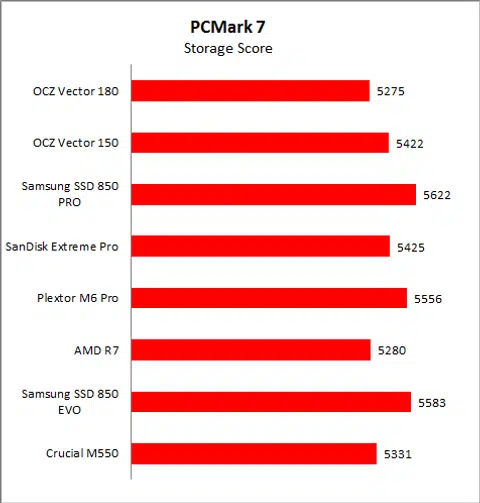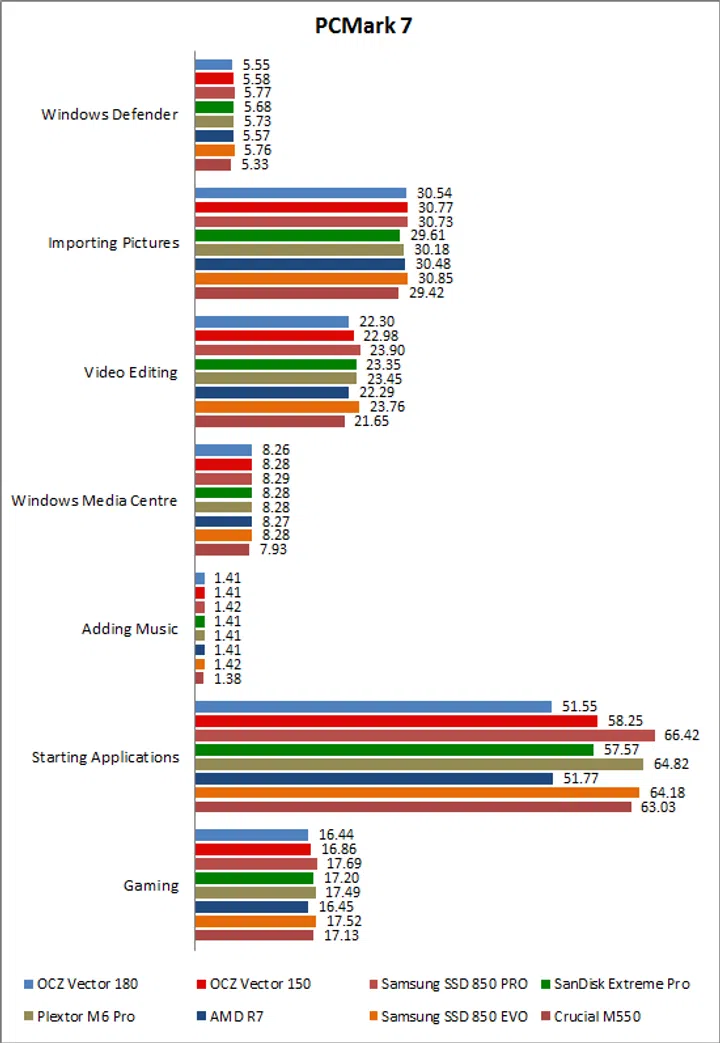 On PCMark 7, the Vector 180’s score of 5275 represented a 2.7% drop in performance when compared to the Vector 150. And if we were to look at the performance breakdown, we noted that the two drives posted similar results in all but the “Starting Applications” workloads, where the Vector 180 was about 11% slower. Its score was also the lowest, but that’s not something we would be overly worried about as the top scoring drive - the SSD 850 Pro - managed a score of 5622, which is only just over 6.5% more.