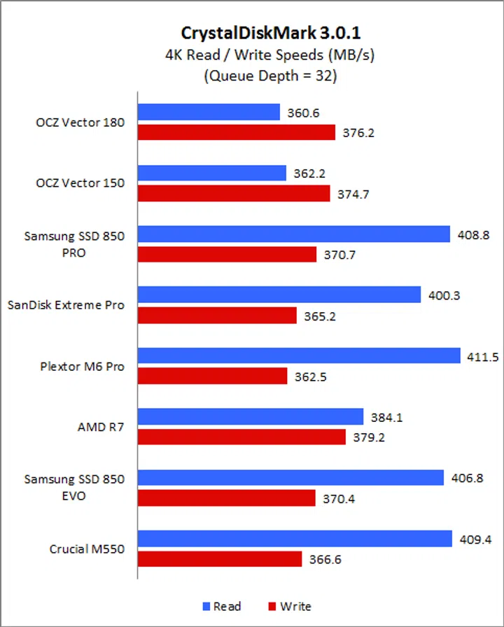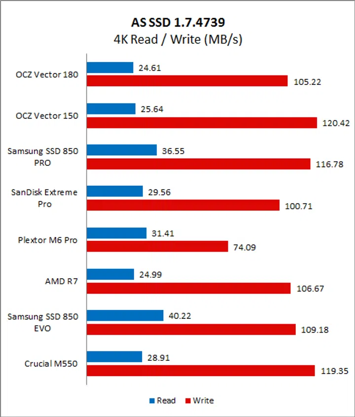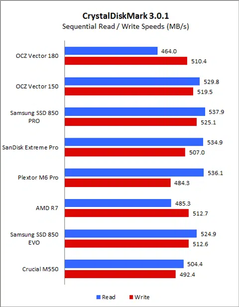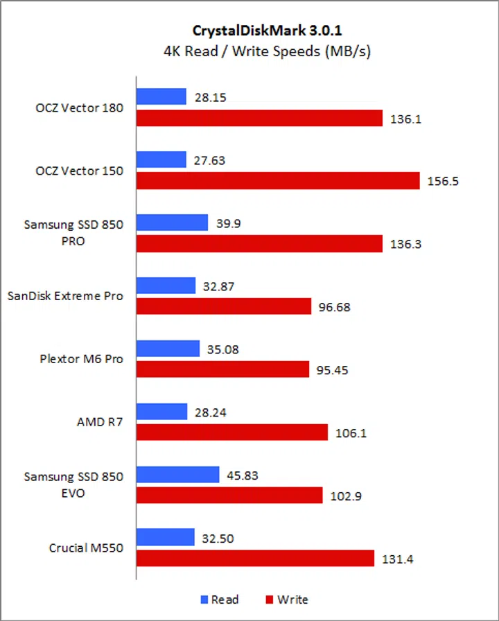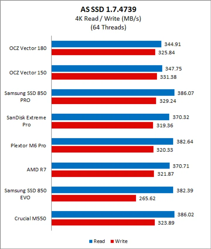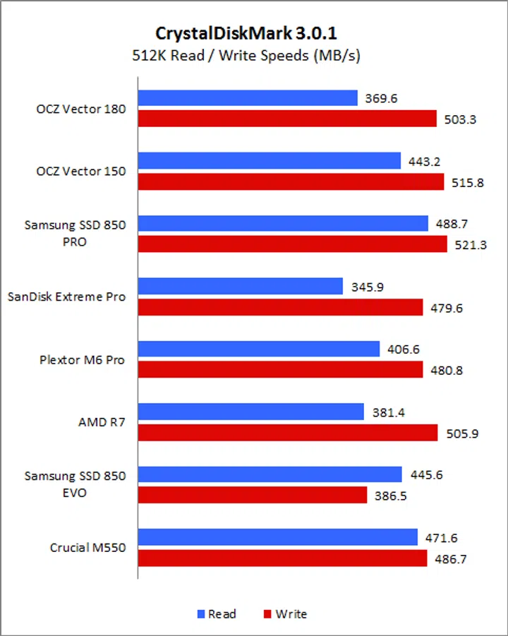 CrystalDiskMark is an easy-to-run and quick utility to use to gauge a drive’s performance. It measures sequential read and write performance and random read and write speeds of random 4KB, 4KB (queue depth 32) and 512KB data. On CrystalDiskMark, the Vector 180 exhibited disappointing read speeds, especially when compared to the Samsung SSD 850 Pro. Even against its predecessor, its read speed on the sequential and 512k workloads were lacking. Fortunately, its write speeds were more encouraging and was competitive across all workloads and was a match for the Samsung SSD 850 Pro. We can see here that the OCZ-manufactured AMD Radeon R7 also exhibited very good write speeds.