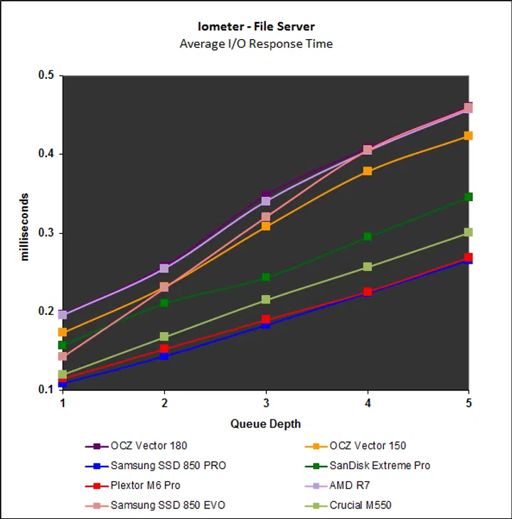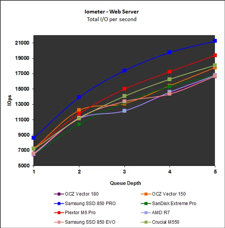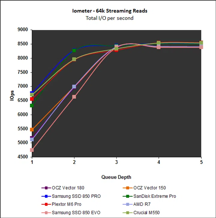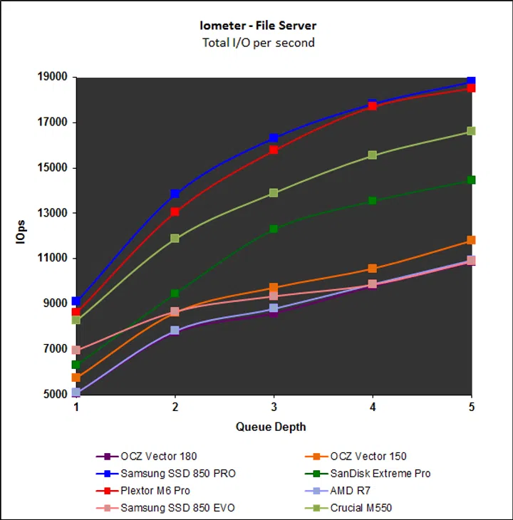 Lastly, we put the drives through the rigorous grind of Iometer, with different workloads and I/O queue depths. We have chosen to show results from a queue depth of 1 to 5 as this better represents the workloads a typical consumer might face. OCZ drives have traditionally performed erratically on Iometer and we noted this in our review of the Vertex 460 early last year. Sadly, the new Vector 180 is no different and despite the newer firmware, its performance is almost a mirror image of the older Vector 150’s. Streaming reads and writes were average at best, but its showing on the File and Web Server workloads were poor. The top performing drives here were the Samsung SSD 850 Pro and Plextor M6 Pro.