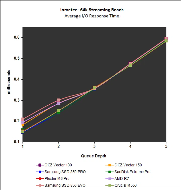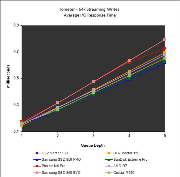 Finally, we look at the I/O response times for the workloads reported on the previous page. Response times for the Vector 180’s streaming reads and writes were in the middle of the pack, and considering its poor showing on the File and Web Server workloads, it was not surprising to see that it recorded the one of the slowest response times on those respective workloads.