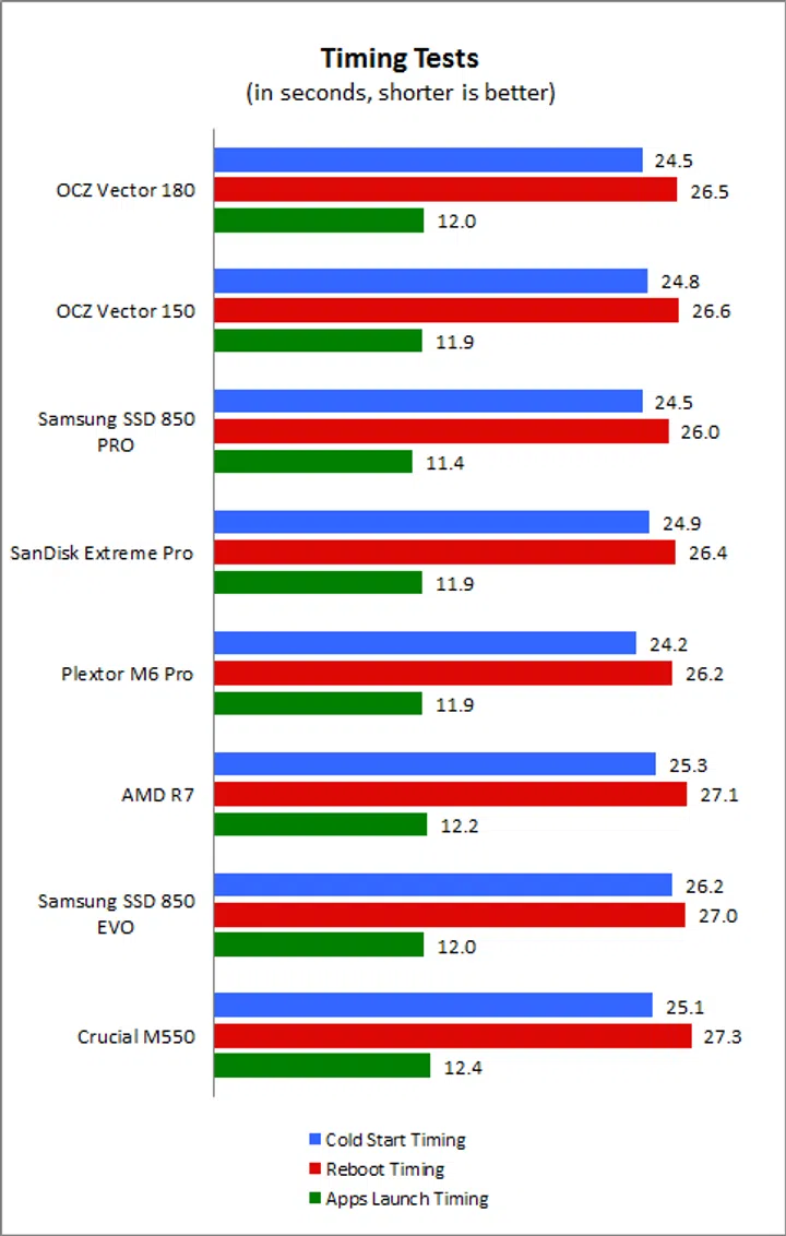 We begin with our timing tests and the OCZ Vector 180 was slightly quicker when it came to cold starts, but on a par when it came to rebooting and launching of apps when compared to the drive that it replaces - the Vector 150. Its timings were certainly decent, but not quite comparable to the Samsung SSD 850 Pro and Plextor M6 Pro, which were the two fastest drives in this test.