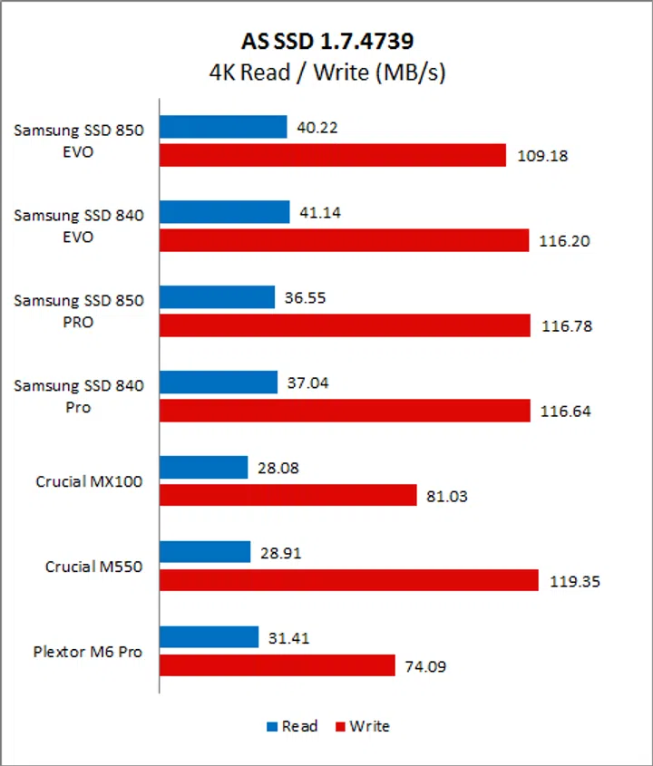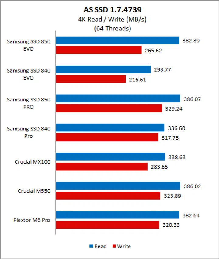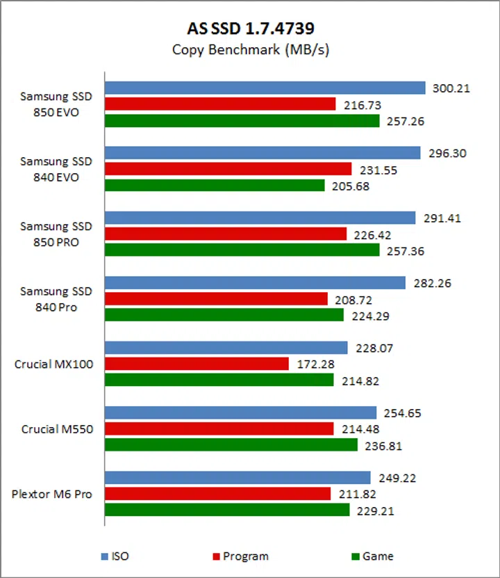 Samsung’s controllers have always been adept at handling non-compressible data and so it should come as no surprise that their performance on AS SSD has always been stellar. Beginning with the Copy Benchmark, we can see that the new SSD 850 Evo is almost on a par with Samsung’s flagship SSD 850 Pro, and also offers improved overall performance when compared to the SSD 840 Pro and SSD 840 Evo. It is also handily faster than both the Crucial drives and even Plextor’s M6 Pro.