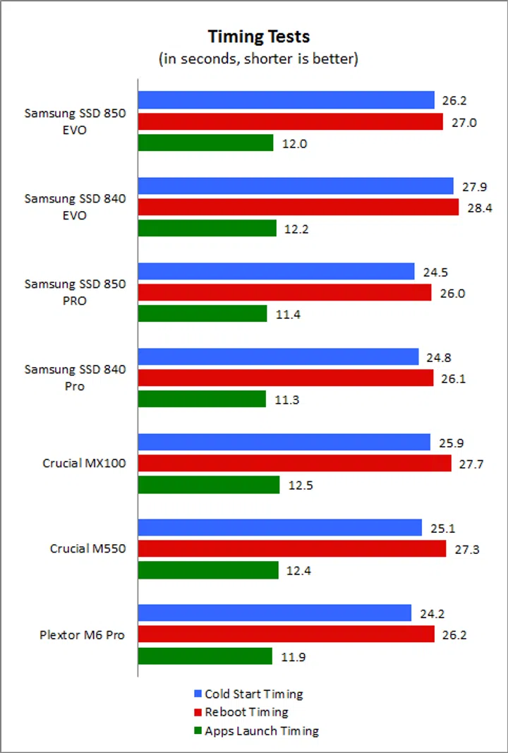 The old Samsung SSD 840 Evo was not the quickest drive in our timing tests, so it is good that the new Samsung SSD 850 Evo improves on the timings recorded by its predecessors quite significantly. The time it took to boot from a cold start was reduced by a significant 1.7 seconds. Subsequently, the SSD 850 Evo could also reboot 1.4 seconds quicker. The SSD 850 Evo’s timings are now more comparable to the Crucial MX100 and M550, its keenest rivals in this segment. The SSD 850 Pro and even the older SSD 840 Pro are still the fastest drives in this test.