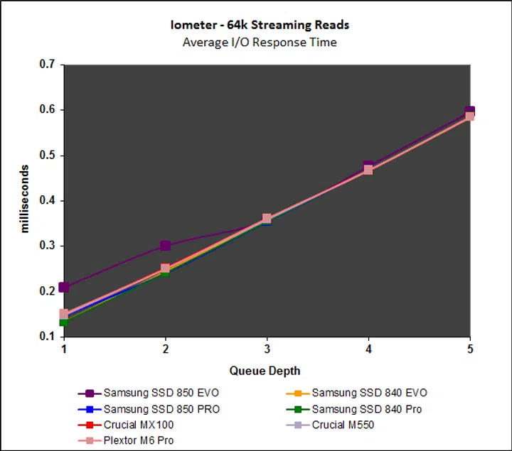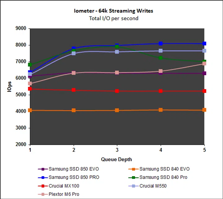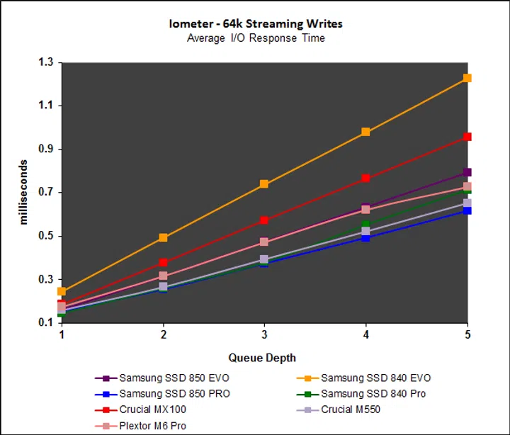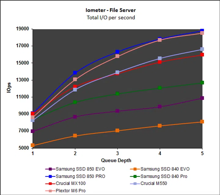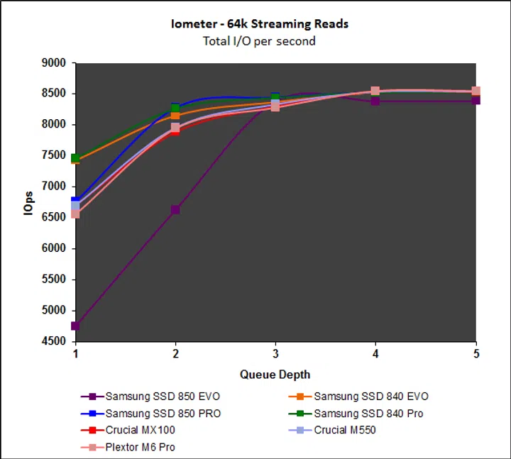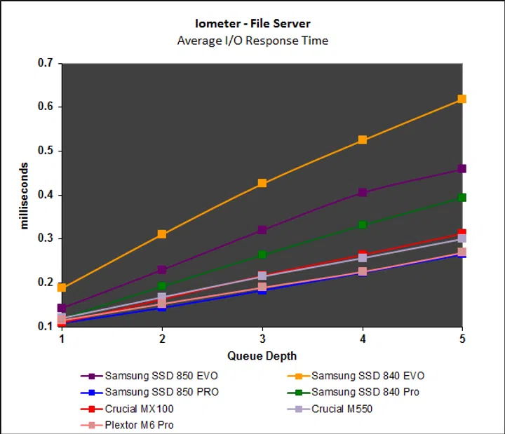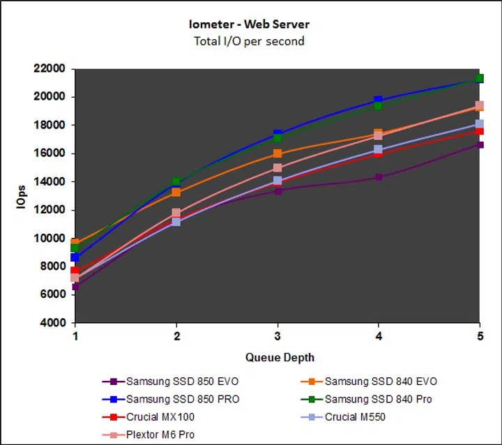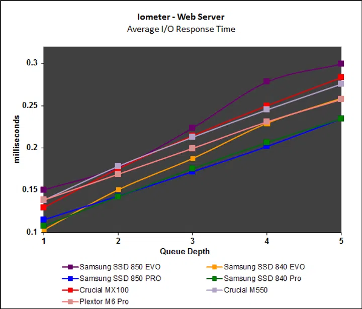 Iometer’s intensive workloads are problematic for mainstream drives like the Samsung SSD 850 Evo, but overall, the drive manages well. Read performance starts off poor, but picks up with increasing queue depth, but more importantly, write performance has been significantly improved. Performance on the File and Web server workloads continue to be disappointing, especially when compared to the Crucial MX100 and M550.