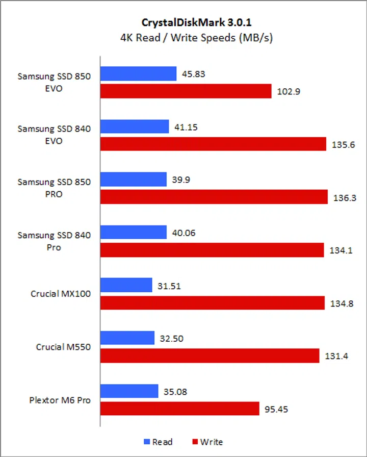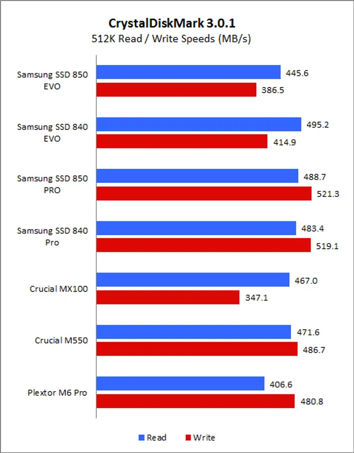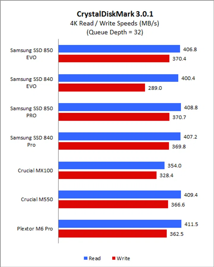 On CrystalDiskMark, the SSD 850 Evo’s speeds was mostly very comparable to the older SSD 840 Evo - especially on the sequential, 512K and 4K read and write workloads. However, we noticed a substantial improvement in write performance when it came to more intensive 4K, 32 queue depth workload. This was the Achilles’ heel of the SSD 840 Evo as its TurboWrite cache was insufficient to boost performance. However, the new SSD 850 Evo was able to overcome this and its performance on this demanding workload was in fact comparable to even the high-end Samsung SSD 850 Pro and SSD 840 Pro.