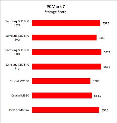 On PCMark 7, the SSD 850 Evo managed slightly improved scores over its predecessor. The old SSD 840 Evo was not shabby, but the SSD 850 Evo now closes the gap between Samsung's mainstream and high-end drives. Its score of 5583 points marks an improvement of around 2%. Compared to the Crucial drives, it scored about 4% more. Looking at the breakthrough of the score, we can see that the SSD 850 Evo’s performance across all scenarios was respectable and consistent.