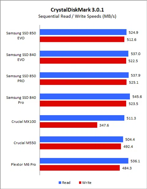 It will be interesting to see how the new SSD 850 Evo matches up against its predecessor, the SSD 840 Evo, and also Samsung’s flagship SSD 850 Pro. We also included results from comparable mainstream drives such as the Crucial MX100 and the Crucial M550.
