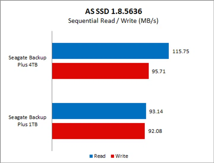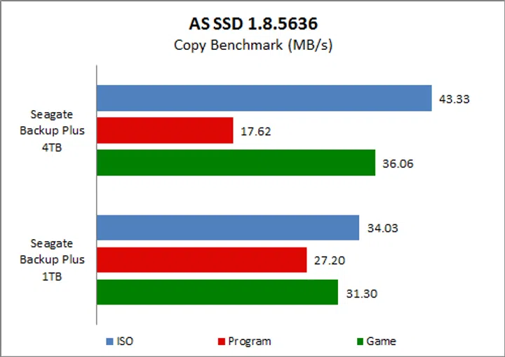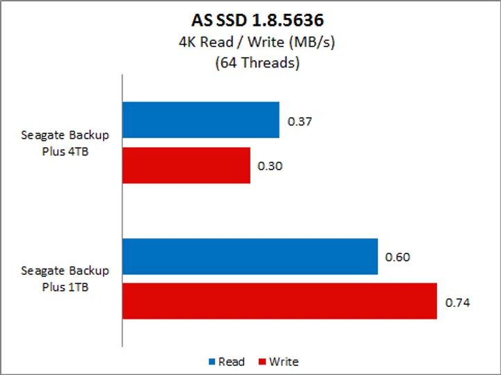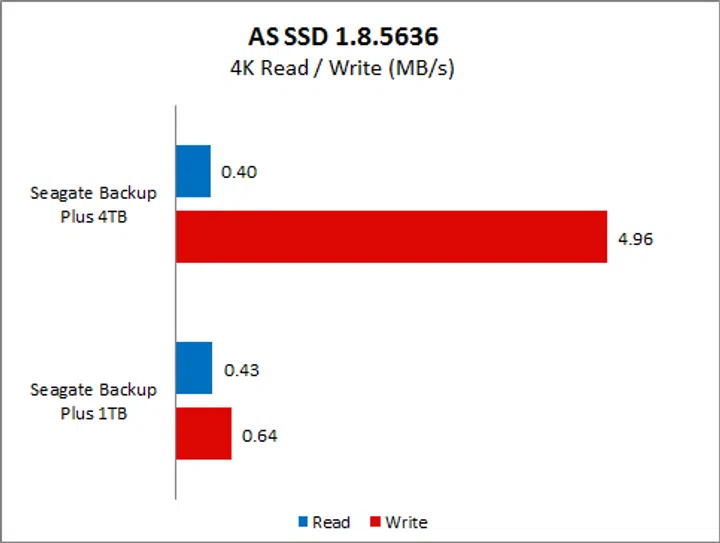 On AS SSD, the two drives were actually quite comparable overall. The new 4TB Backup Plus enjoyed higher sequential read speeds and was also surprisingly quick when it came to 4K writes. However, its performance dipped quite considerably on the more intensive 4K, 64 queue depth workloads. Here, its read and write speeds were only half of that of the 1TB Backup Plus. Nevertheless, it’s worth noting that most users won’t subject their portable external hard disk drives to such workloads since they will only be mostly used for copying large files or backups. In that respect, the new 4TB Backup Plus performs commendably.