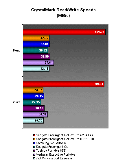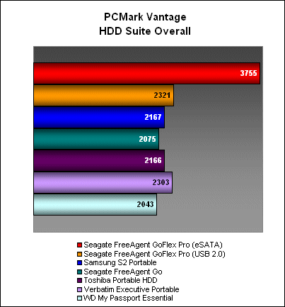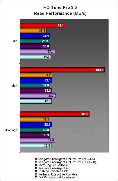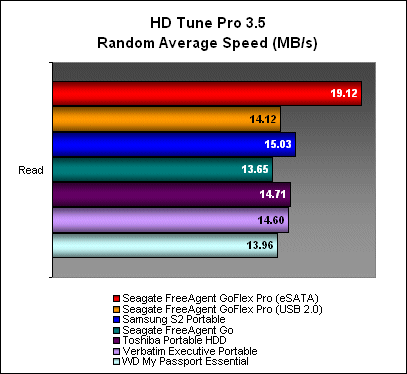 Over on the USB 2.0 performance side of things, the Verbatim drive has a notable lead in performance with its USB Turbo Speed drivers instead of the default drivers by the OS. The custom driver streamlines the USB interface overhead to derive better performance. With that said, the new Seagate GoFlex Pro drive fares quite competitively with the rest of the drives in this comparison. It's marginally better than the FreeAgent Go model, but that's to be expected since the Pro version is a 7200rpm drive.