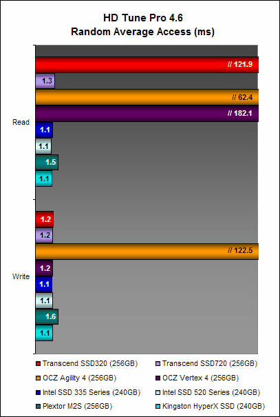 The SSD320’s random write performance was also decent as it only a smidge slower than the SSD720 and slightly slower than other speed demons such as the Intel SSD 520 Series and Kingston HyperX. However, random read performance was poor, managing a mere 8 IOPS, which consequently resulted in poor random access times too.