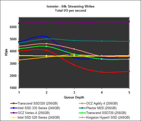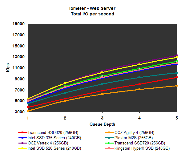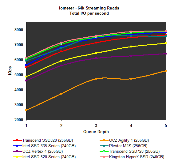 On Iometer, the Transcend SSD320 performed as we would expect from a mainstream SSD. It’s 64k streaming reads IOPS was middle of the pack, but its 64k streaming writes performance took a significant dip as the queue depth increased. Performance on the File and Web server was towards the bottom of the pack, a position it shared with the OCZ Agility 4.