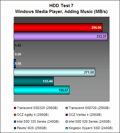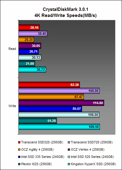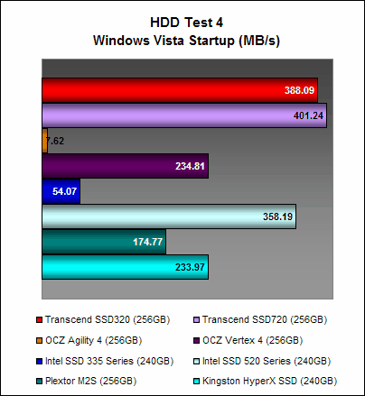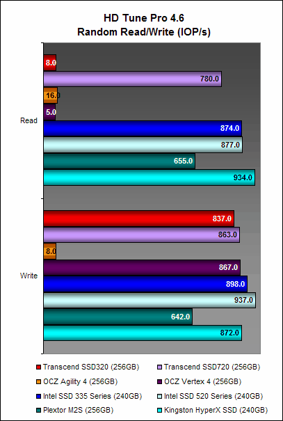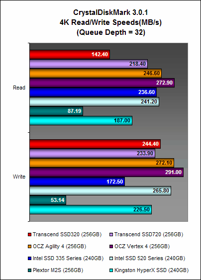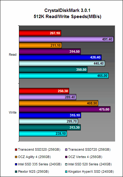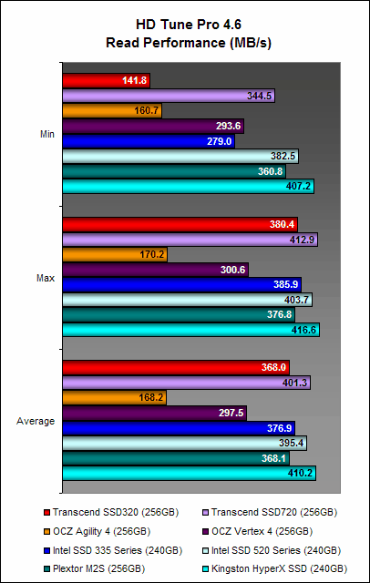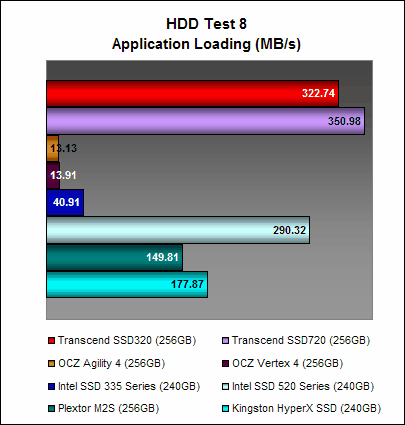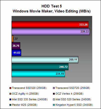 Here, the Transcend SSD320 once again showed that while its write performance was no slouch, its read performance was significantly poorer than the Transcend SSD720. This is no doubt due its slower asynchronous NAND memory. The OCZ Agility 4, which also has asynchronous NAND memory, was arguably the better performer and this could point to the efficiency of its Indilinx Everest 2 controller at negating the shortcomings of asynchronous NAND memory.