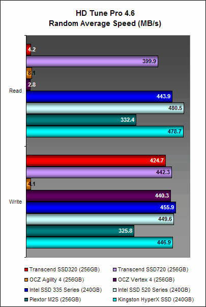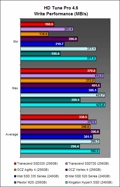 On HD Tune, the Transcend SSD320 gave a more encouraging performance. Average speeds during the standard read and write tests were not too far off the mark from the Transcend SSD720 and were within the same range as the rest of the drives, even the formidable Intel SSD 520 Series.