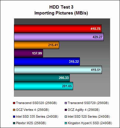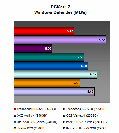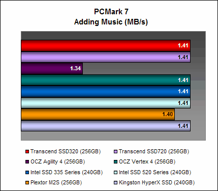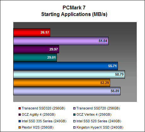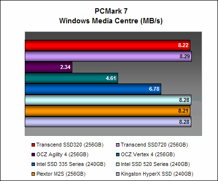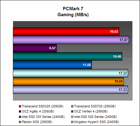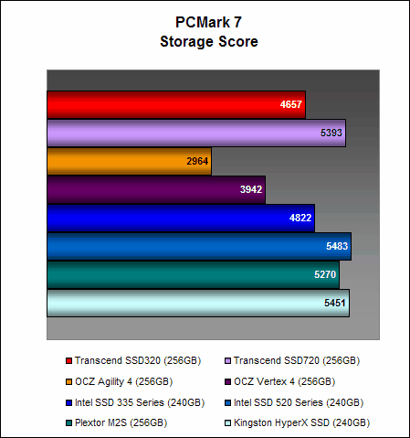 On PCMark 7, the Transcend SSD320 managed 4657 PCMarks, which is comparable to the Intel SSD 335 Series and ahead of the OCZ Vertex 4. It is a decent showing, but it was still almost 14% lesser than what the Transcend SSD720 could achieve, showing again the disparity in performance between Transcend's high-end and mainstream offerings. Interestingly, it was performing much better than the OCZ Agility 4 on this test.