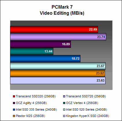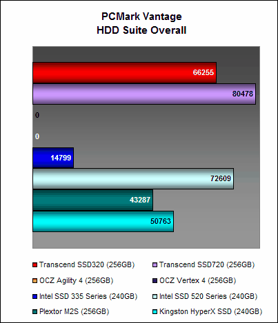 Although PCMark Vantage has been giving some of the newer drives problems lately, the Transcend SSD320 had no problems in completing this benchmark. It scored 66255 PCMarks, which was 18% less than Transcend’s flagship SSD720 - not too shabby. Once you peer at the detailed breakdown of results, you can see that the SSD320 is actually a very competent performer in most cases.