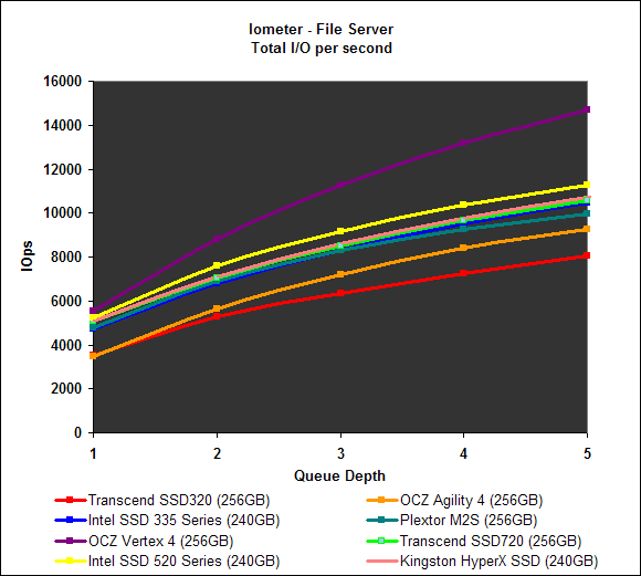 Lastly, we put the drives through the rigorous grind of Iometer, with different workloads and I/O queue depths. We have chosen to show results from a queue depth of 1 to 5 as this better represents the workloads a typical consumer might face.