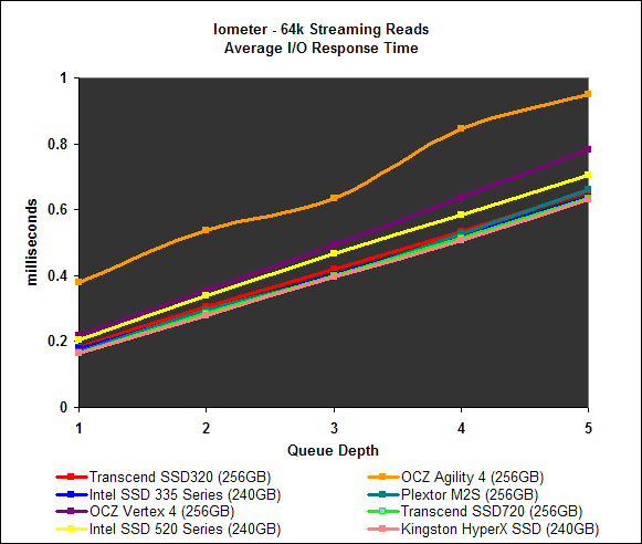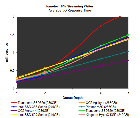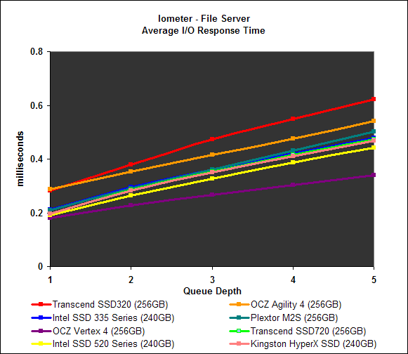 Finally, we look at the I/O response times for the workloads reported on the previous page. Overall, the Transcend SSD320’s response times made it one of the less responsive drives of the pack, along with the OCZ Agility, which incidentally also has asynchronous NAND memory. This is not surprisingly given that it has asynchronous NAND memory, which means it can only transmit data on either the rise or fall of the clock cycle, not both.