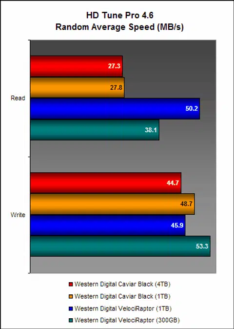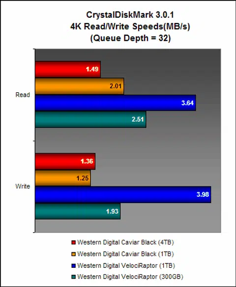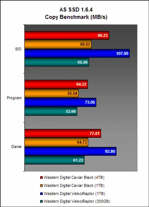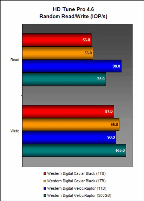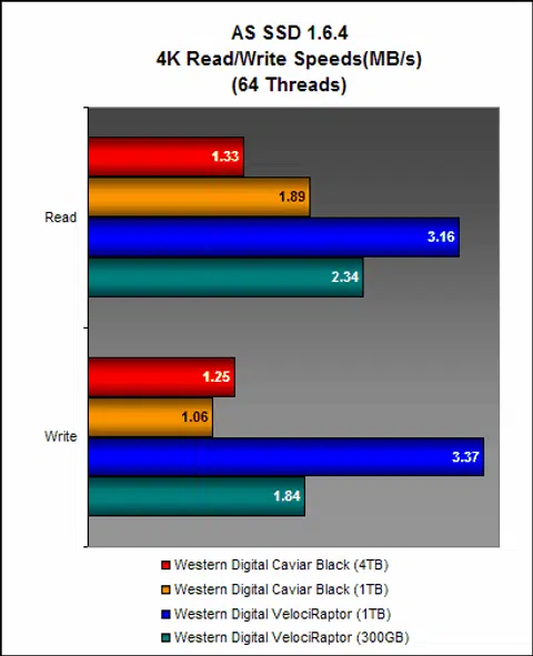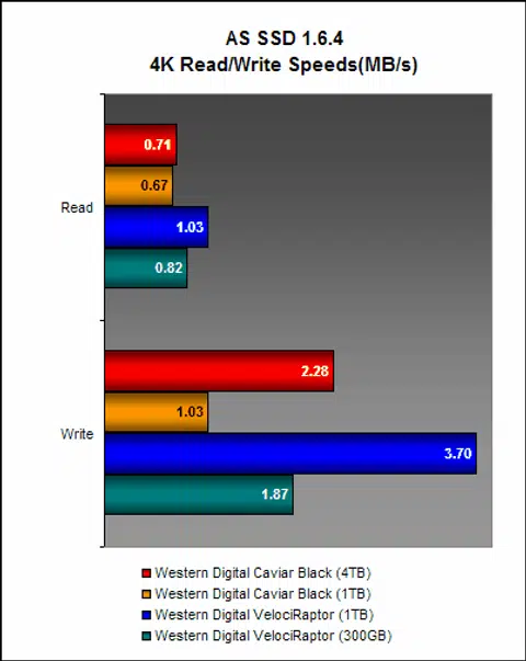 Sequential read and write speeds of the WD Black 4TB was pretty impressive as it was markedly quicker than even the old 300GB VelociRaptor drive and also the WD Black 1TB drive. This was also true for its copy speeds in the Copy Benchmark, which simulated copy workloads. However, on the more intensive 4k and 4k, 64 thread workloads, the VelociRaptor drives gained the upper hand.