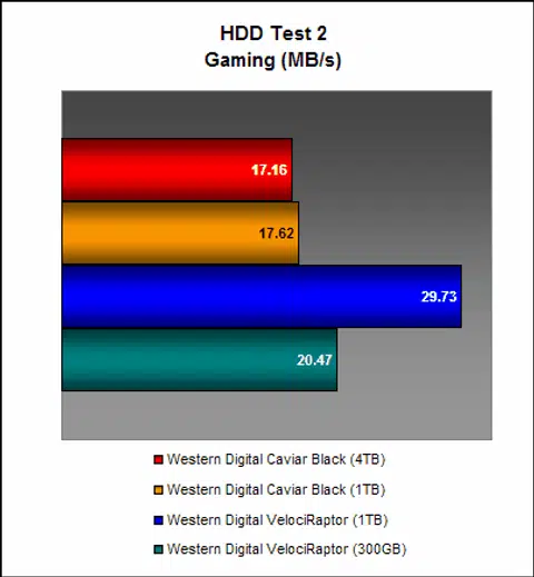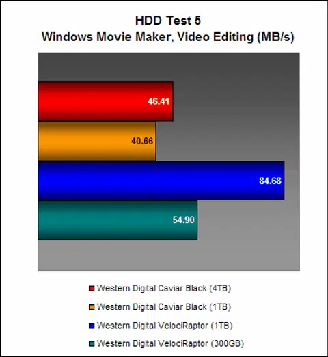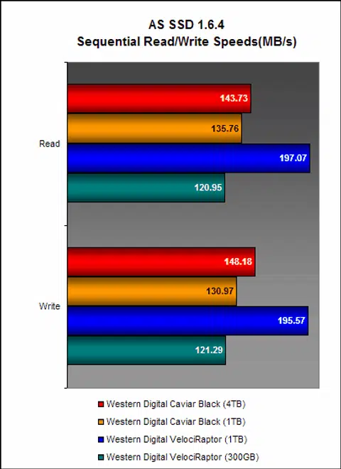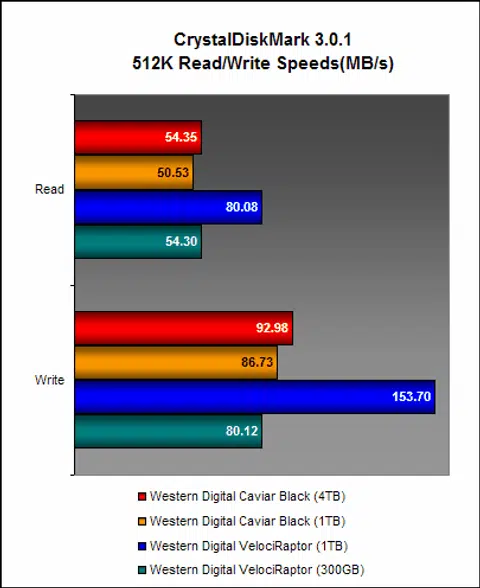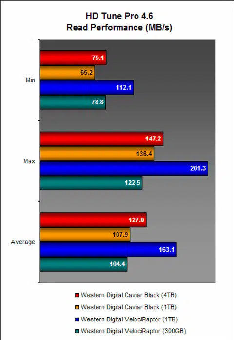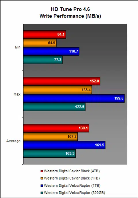 Read and write performance of the new WD Black 4TB drive was generally impressive as it was markedly quicker than both its 1TB sibling and the old 300GB VelociRaptor drive - by around 20%. Nevertheless, it was outclassed by the latest 1TB VelociRaptor drive.