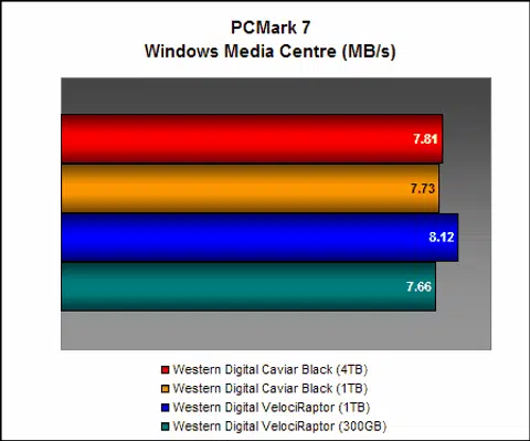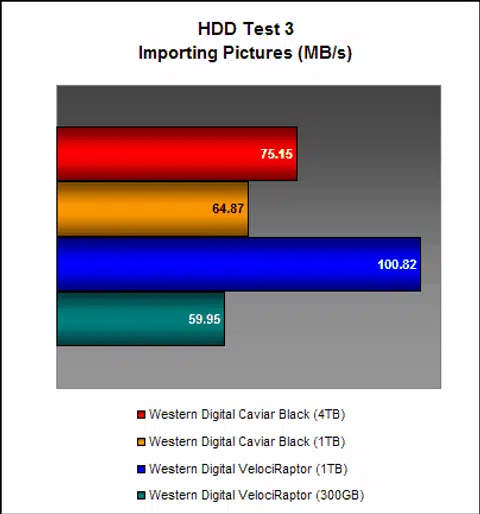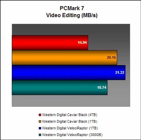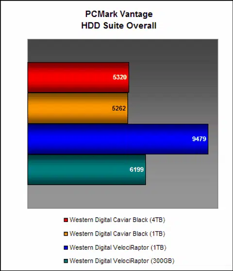 On PCMark Vantage, the WD Black 4TB and 1TB drives recorded almost identical scores - 5320 vs. 5262 PCMarks. However, if you were to examine the breakdown of the scores, you would find that the 4TB drives excelled on certain workloads while the 1TB drive did better on others. Leading the pack here was the new 1TB VelociRaptor drive.