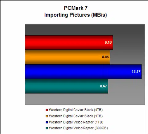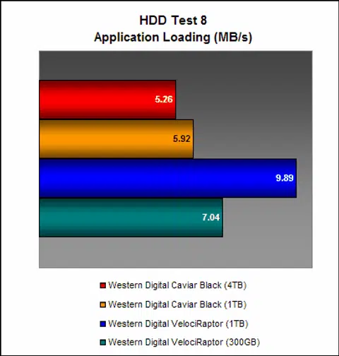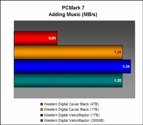 The new WD Black 4TB drive has performed admirably thus far, but it stuttered on PCMark 7, recording a mere 1336 PCMarks. This was over 35% less than the WD Black 1TB’s 2108 PCMarks. This was also less than half of what the blazing quick VelociRaptor 1TB drive scored.
