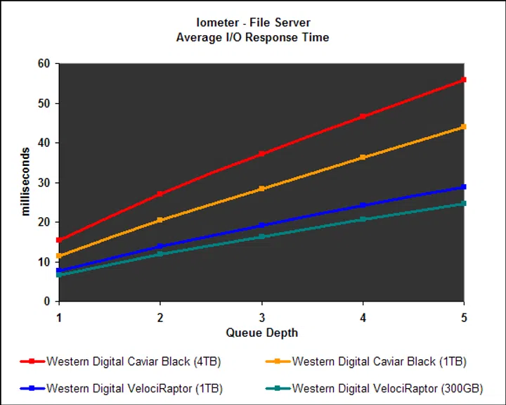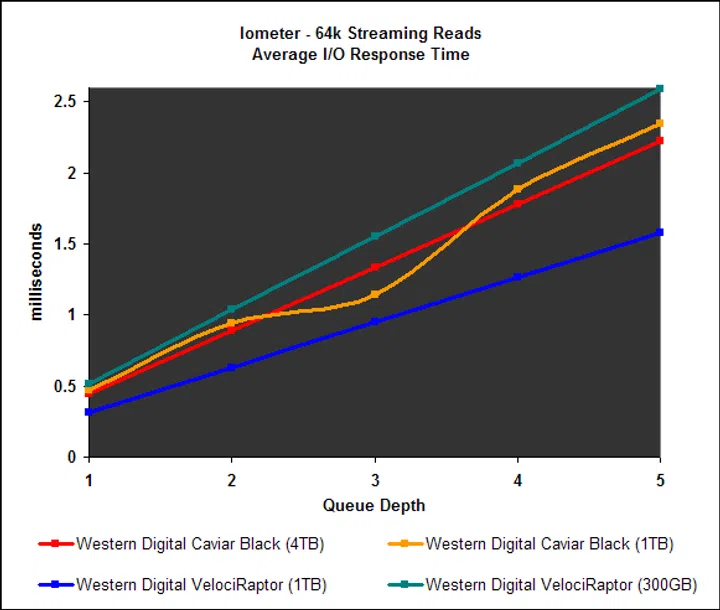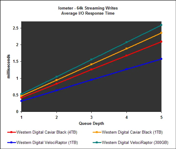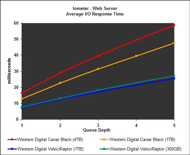 Lastly, we look at the I/O response times for the workloads reported on the previous page. In terms of response times, the 64k streaming read and write response times for the WD Black 4TB drive was generally better than the WD Black 1TB and the older 300GB VelociRaptor drive. However, timings took a significant turn for the worse when coming to the file and web server workloads, which also explained its poor IOPs reading in these two workloads on the previous page. As explained, this is likely attributed to the five-platter hard drive design used.