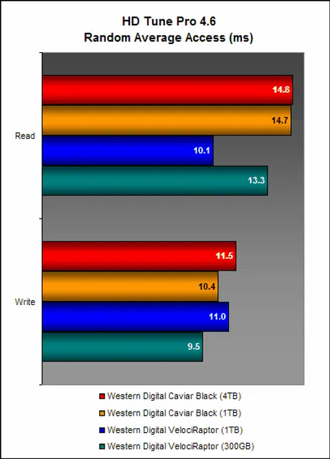 Looking at random access performance, the Caviar Black 4TB was just about on a par with the 1TB variant. The 300GB VelociRaptor drive, which was earlier outclassed by the Caviar Black 4TB, managed to claw back a win and posted appreciably higher average speeds and lower access times.
