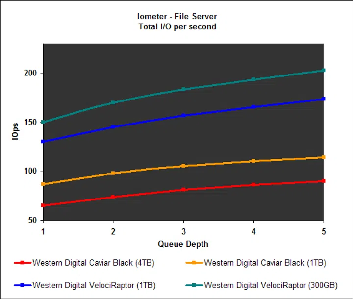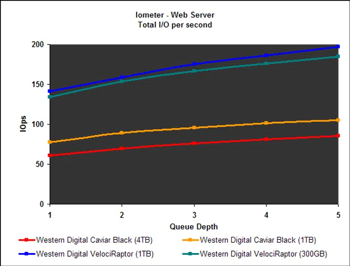Looking at the 64k streaming read and write workloads, we can see that the WD Black 4TB drive held a comfortable lead over the 1TB variant and also the older 300GB VelociRaptor drive. However, on the more enterprise-related intensive file and web server workloads, the WD Black 4TB drive recorded the poorest scores. Those workloads tend to be more harsh and requires faster access times, which the multi-platter 4TB drive couldn't cope as well as the single-platter 1TB counterpart.