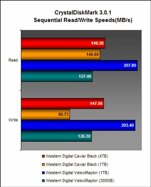 To evaluate the new WD Black 4TB’s performance characteristics, we will be comparing it against the popular 1TB model from the same Caviar Black lineup. Additionally, we have included results from the new and recently tested 1TB VelociRaptor drive and also the older 300GB VelociRaptor drive. And since we’ve shown in the review of the 1TB VelociRaptor that even the latest and fastest mechanical hard disks are no much for even run-of-the-mill SSDs, we will refrain from including results from SSDs in this comparison.