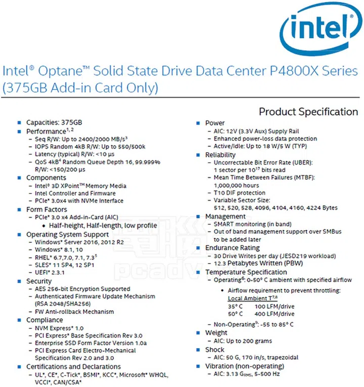 Finally, the drive boasts much-improved endurance in the form of a 12.3PB lifetime rating for data written. This is the equivalent of 30 full drive writes per day, so the P4800X should hold up well in a demanding enterprise environment.