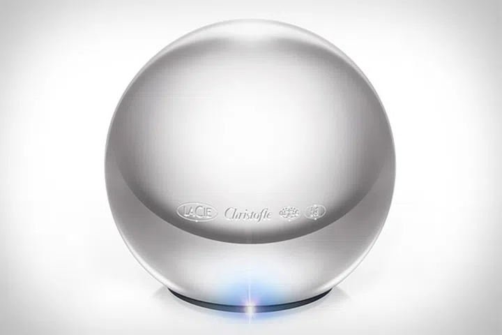The LaCie Sphere comes with 1TB of storage, USB 3.0, and looks like a work of art from outer space. Designed by Christofle with technology from LaCie, the Sphere is hand-crafted and silvered in France. The Sphere is powered through its USB cable, so no power cord is needed.