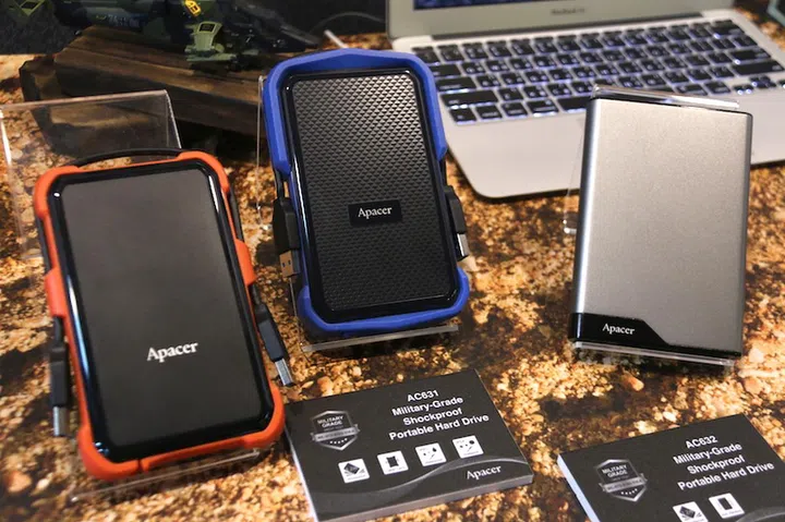 Besides the formidable AC730, Apacer also has an array of more regular portable hard drives with simpler protection needs, such as these three military-grade USB 3.1 Gen 1 portable hard drives (AC630, AC631 and AC632) – where the former two feature built-in rubber frames for shockproof protection, and IP55 certification for dustproof and waterproof operation. The AC632, on the other hand, features anti-vibration resistance to reduce the likelihood of data loss and hard drive failure. All three drives passed the U.S. military drop test (MIL-STD-810G 516.6), making them resistant to falls of 1.22m high.