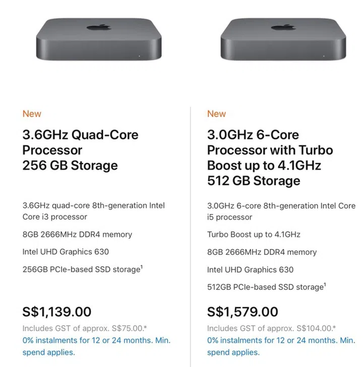 The standard configurations of Mac Mini now come with double the storage capacity. The S$1,139 configuration comes with 256GB PCIe-based SSD storage and a 3.6GHz quad-core 8th-generation Intel Core i3 processor while the S$1,579 configuration comes with 512GB PCIe-based SSD storage and 3.0GHz 6-core 8th-generation Intel Core i5 processor.