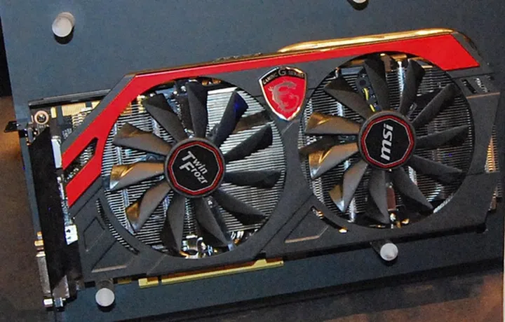 The MSI GeForce GTX 770 Lightning card is the one below the AMD Radeon 7970 card . Both cards feature Military Class III components.